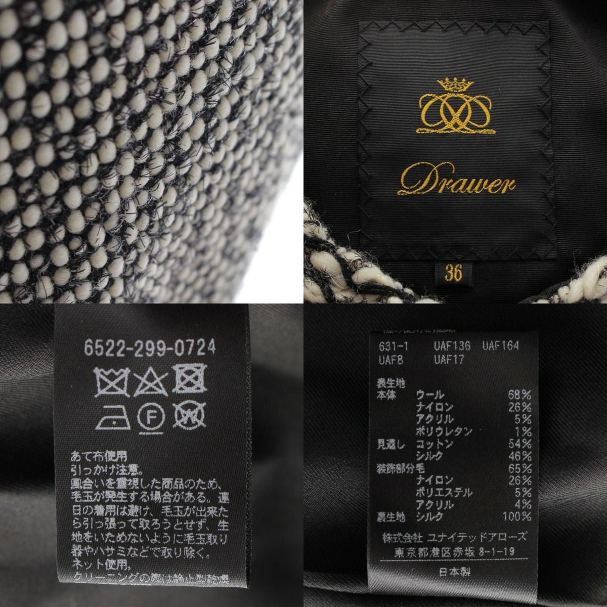 ドゥロワー DRAWER 22年 ノーカラー ツイード ジャケット トップス 6522-299-0724 ホワイト ブラック 36