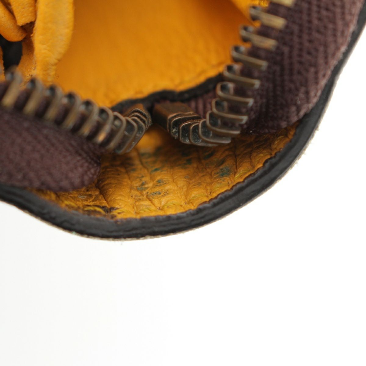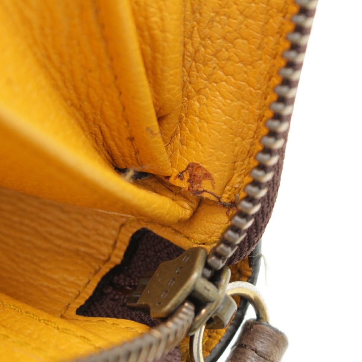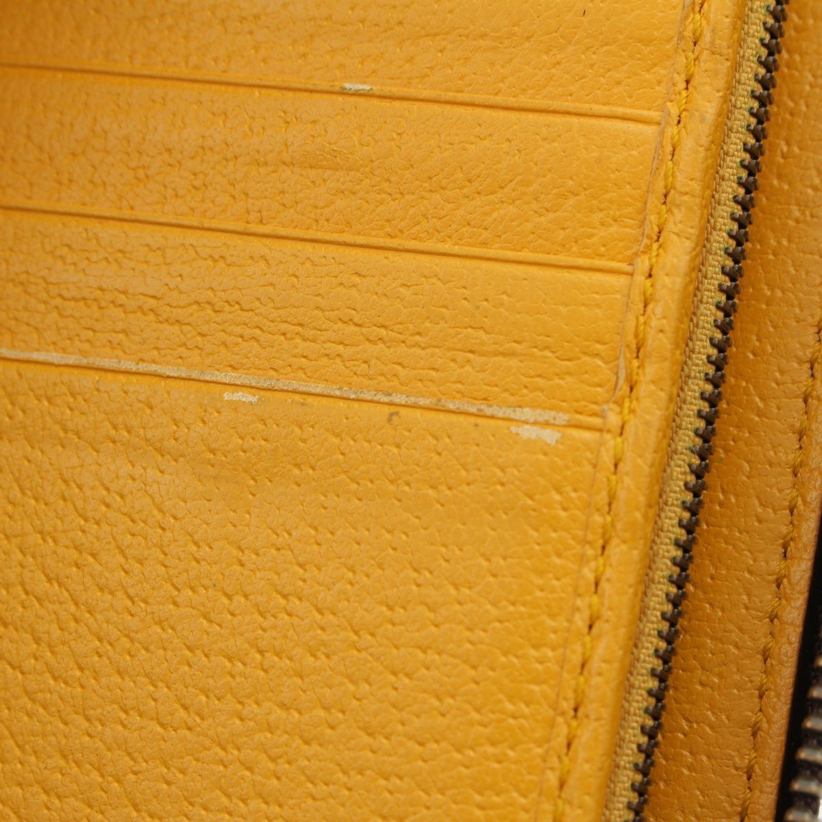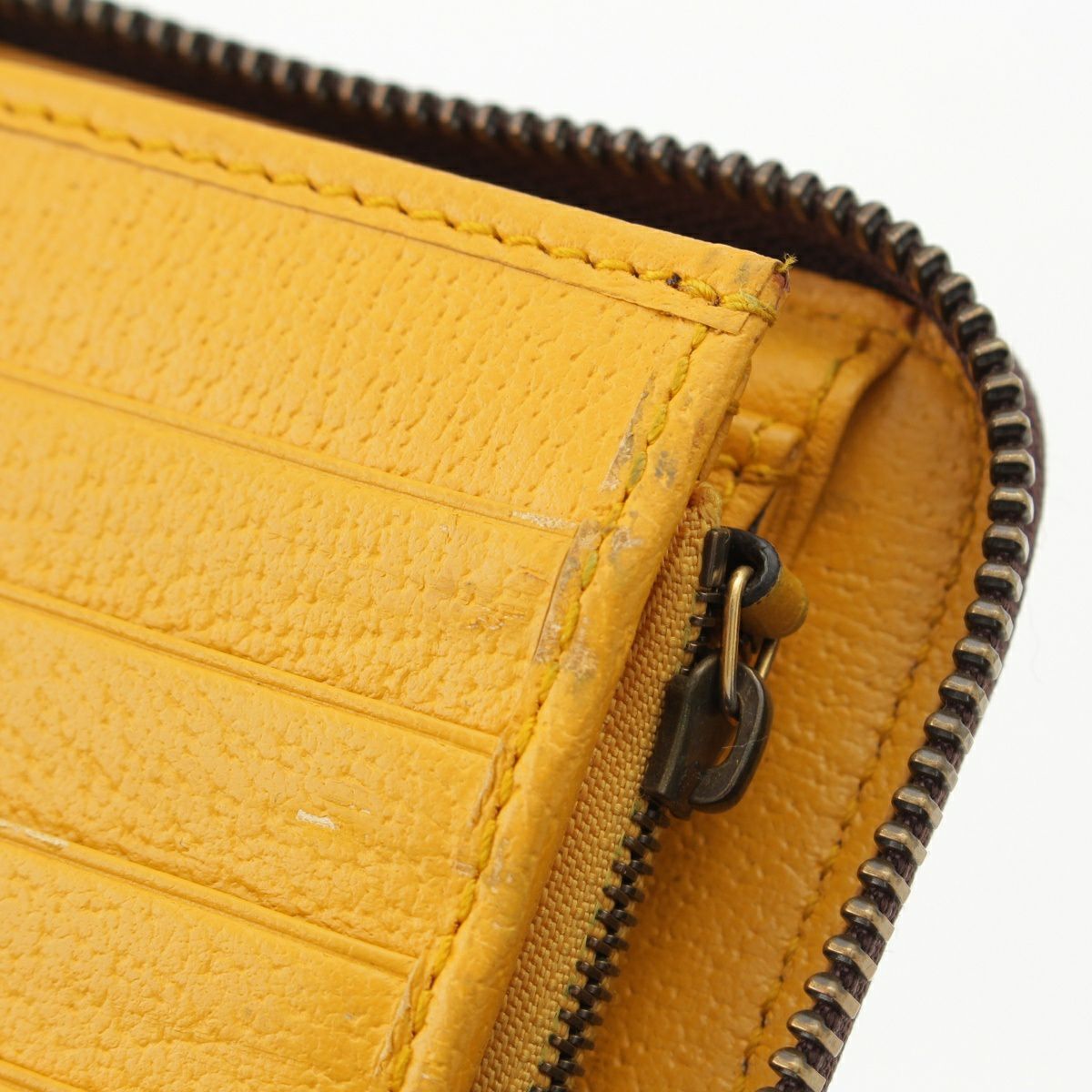 ダメージ箇所: カードポケット・オープンポケットに汚れ/擦れ、ファスナーに汚れ/変色/擦れ/傷、ファスナーストラップに、内側レザーに汚れ/擦れ/傷/緑青、ロゴ・金具に変色/劣化、保管臭のようなニオイ