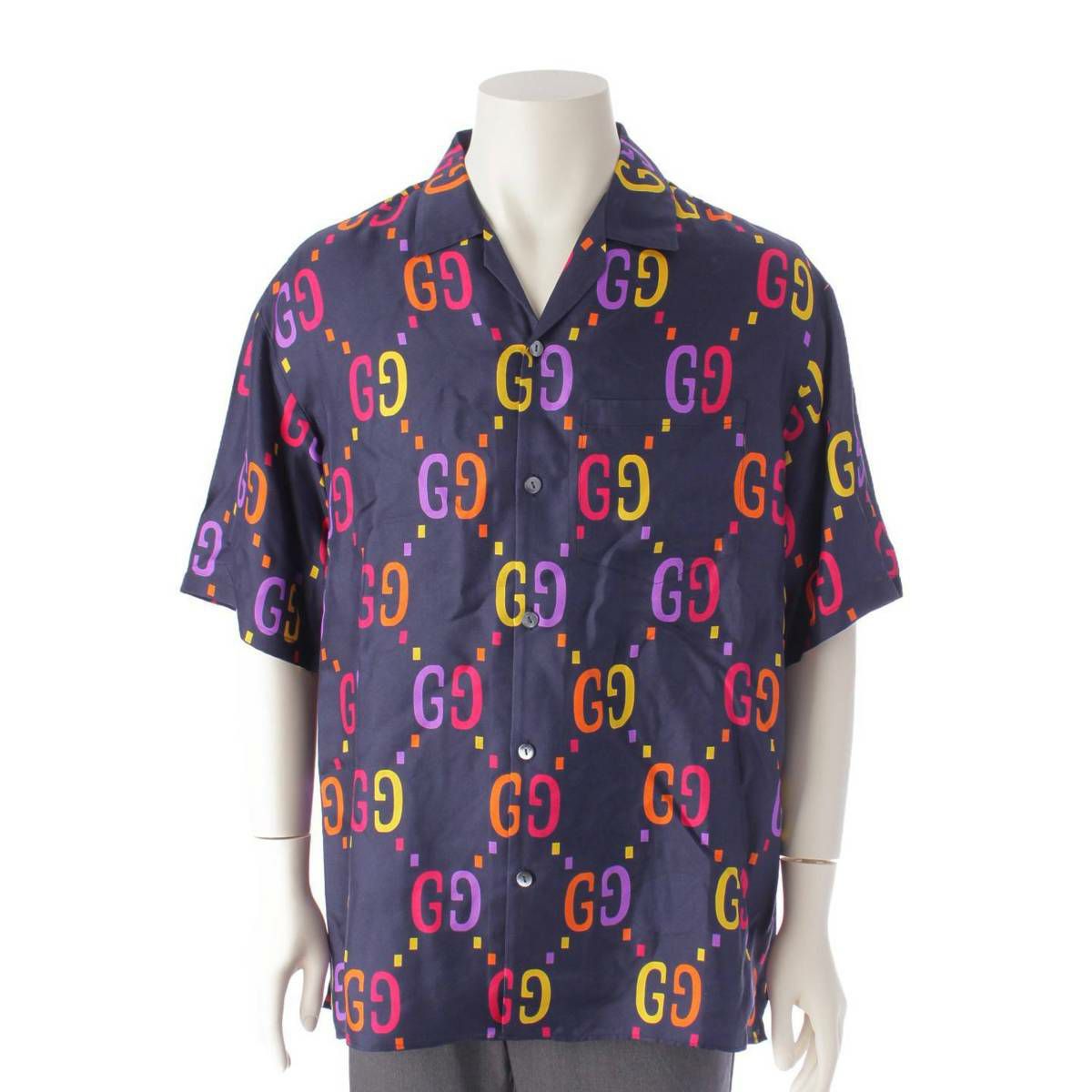 グッチ Gucci メンズ GGプリント シルク 半袖 シャツ トップス 694124 ネイビー 50