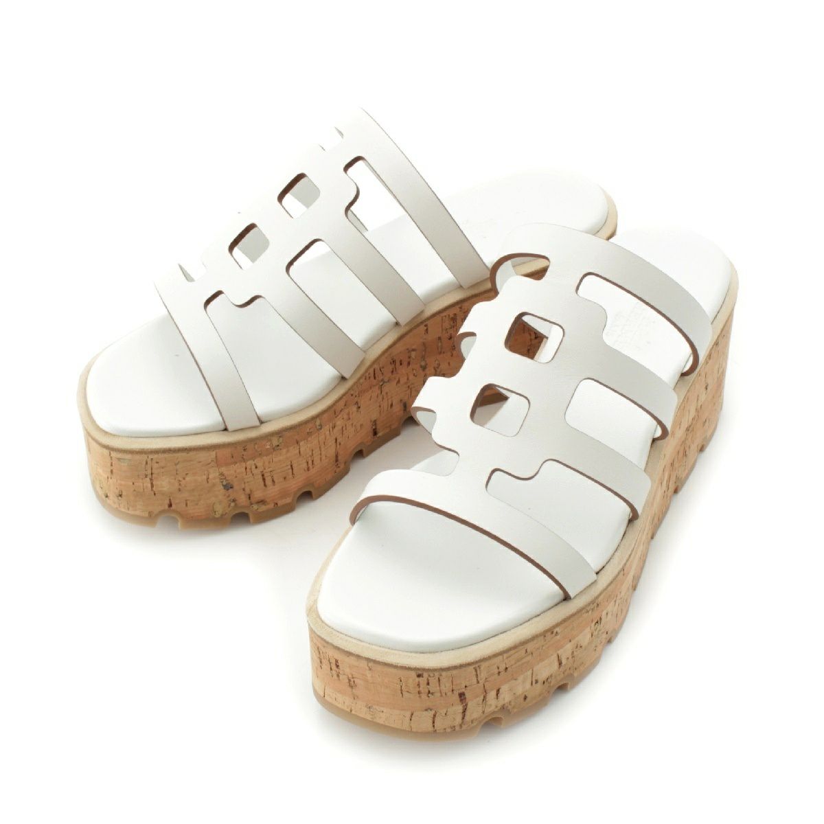 エルメス イザベラ 30 レザー コルク プラットフォーム サンダル ミュール シューズ H241120Z ホワイト ベージュ 35