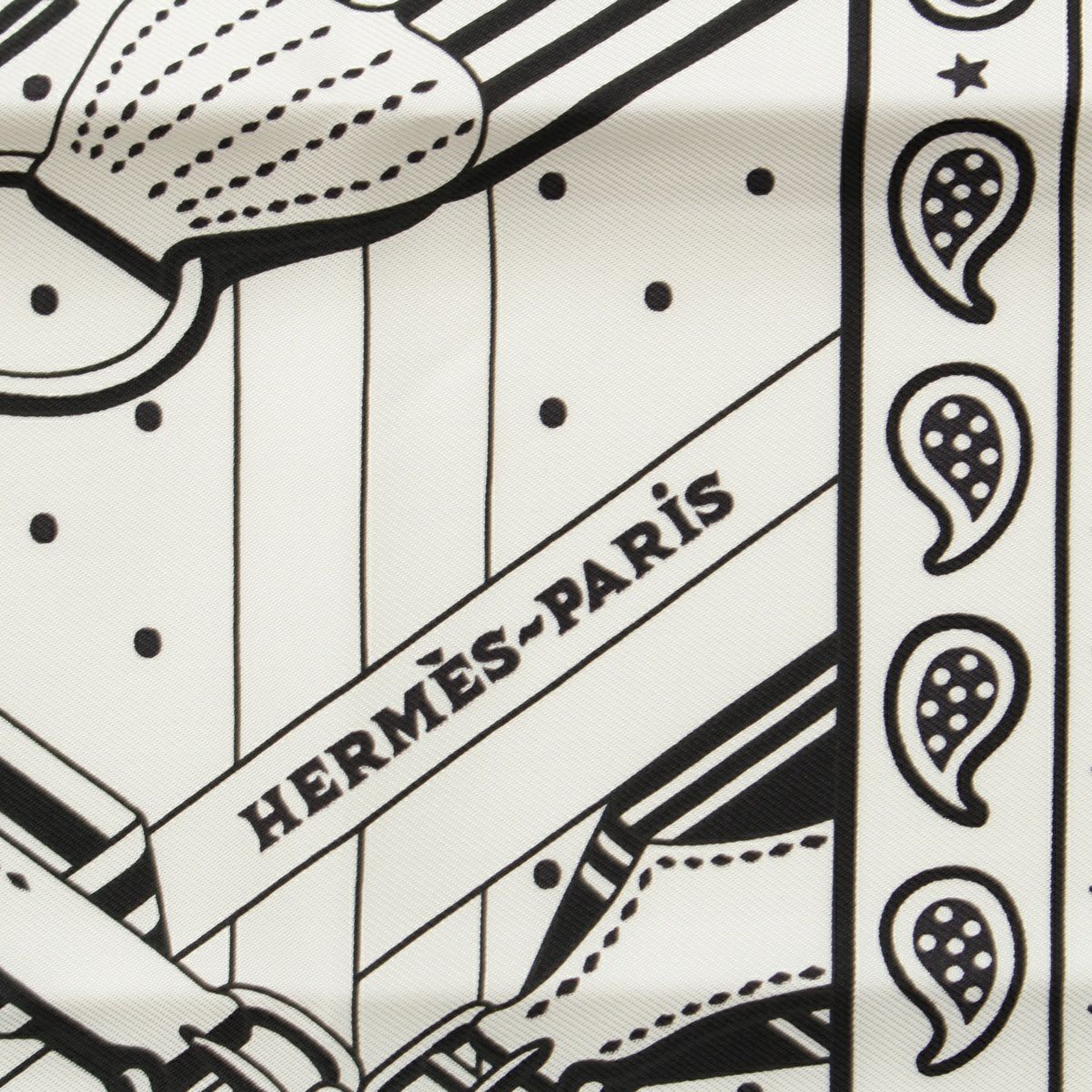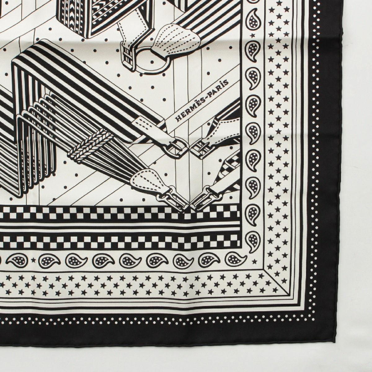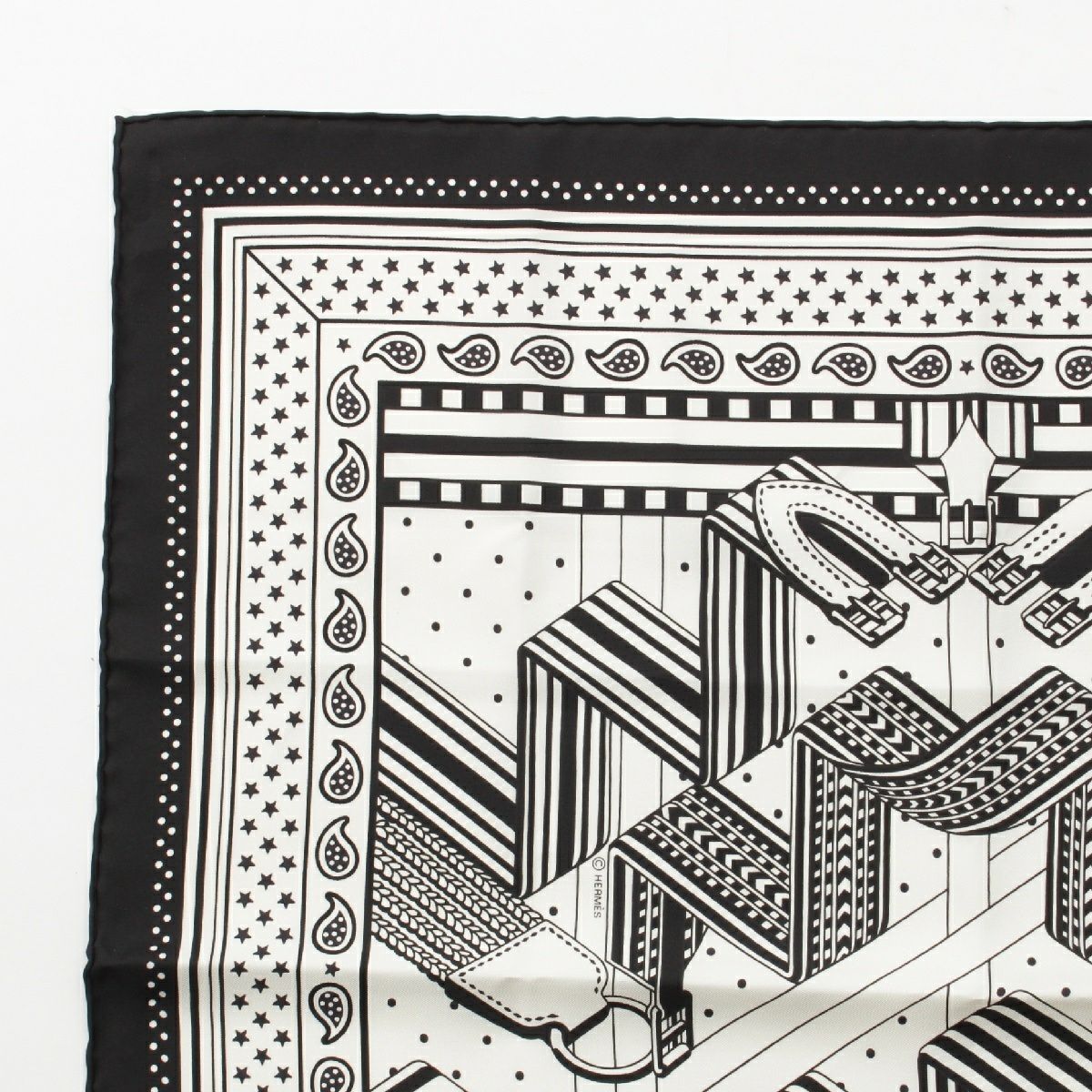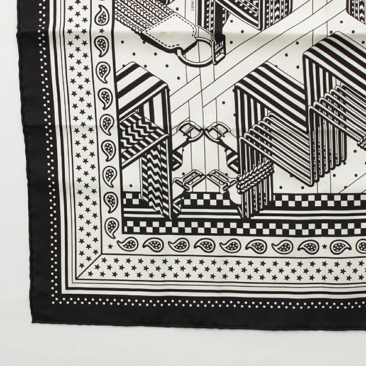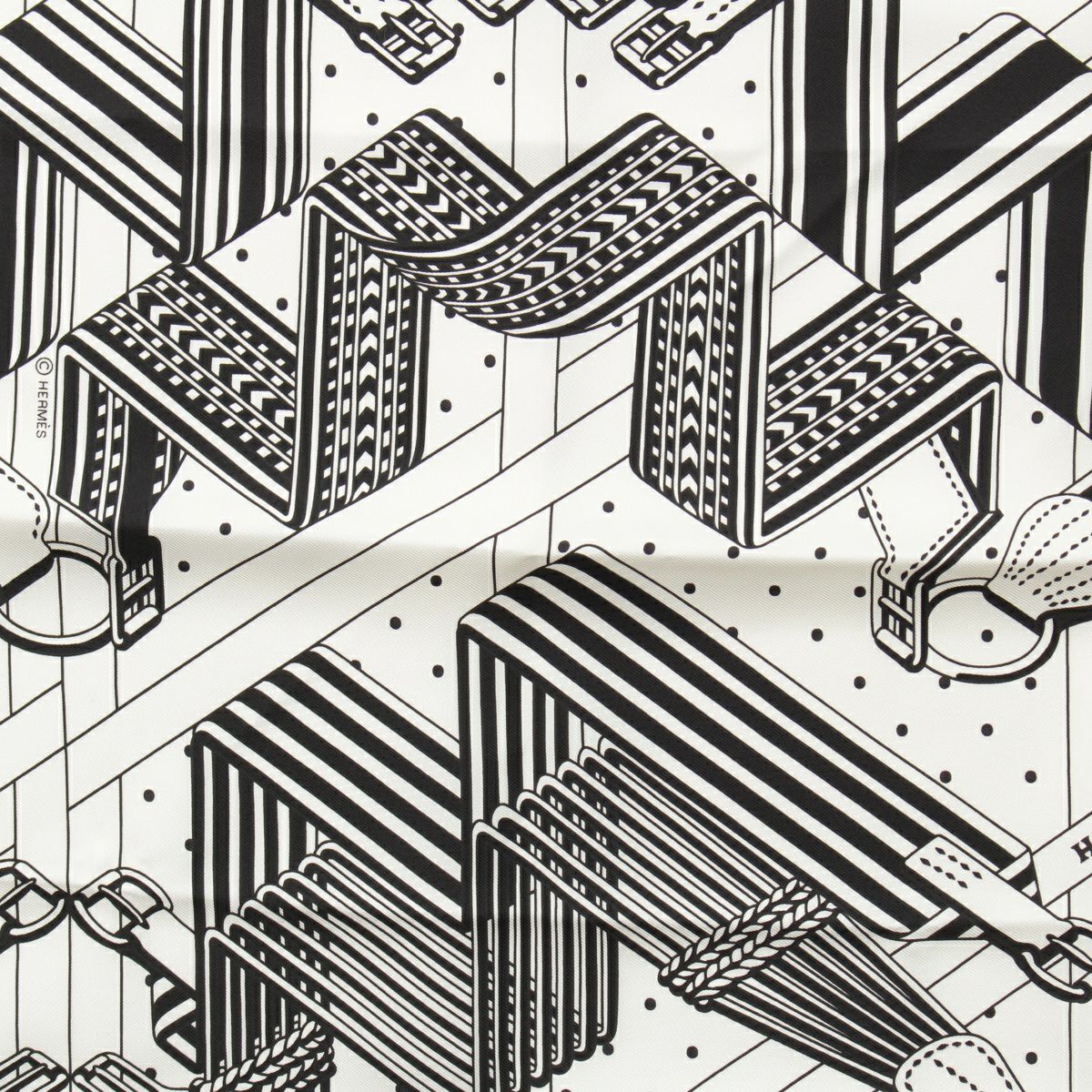 エルメス バンダナ 55 シルク SANGLES EN ZIGZAG ジグザグのサングル スカーフ ブラック×ホワイト