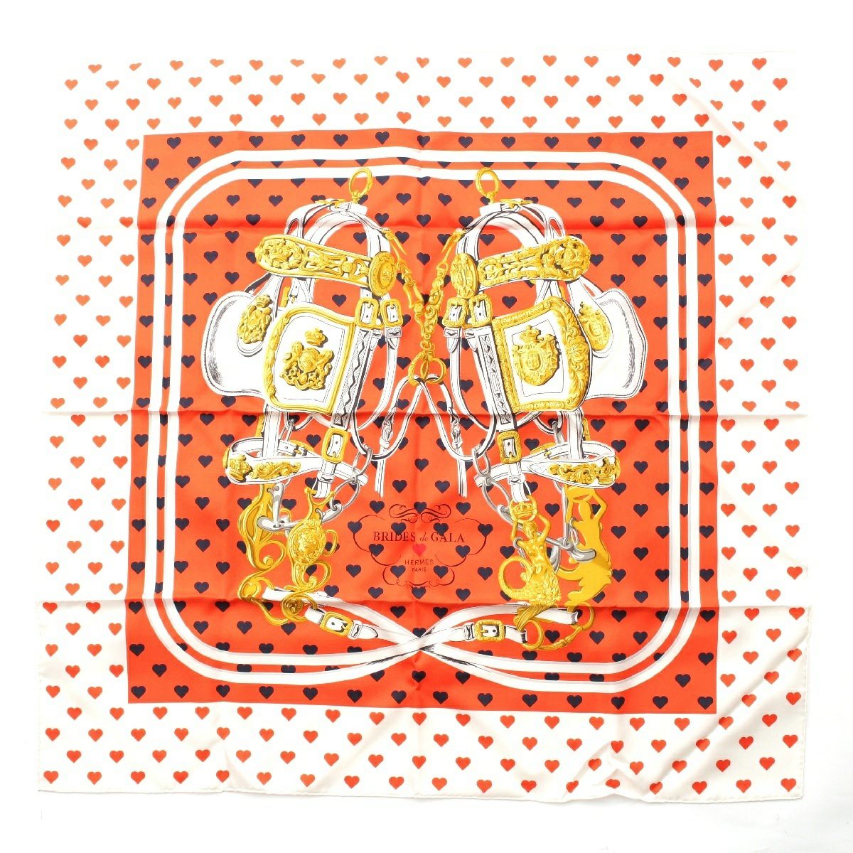 エルメス 限定品 カレ90 シルク BRIDES de GALA LOVE 式典用馬勒 ハート ドット スカーフ オレンジ ホワイト