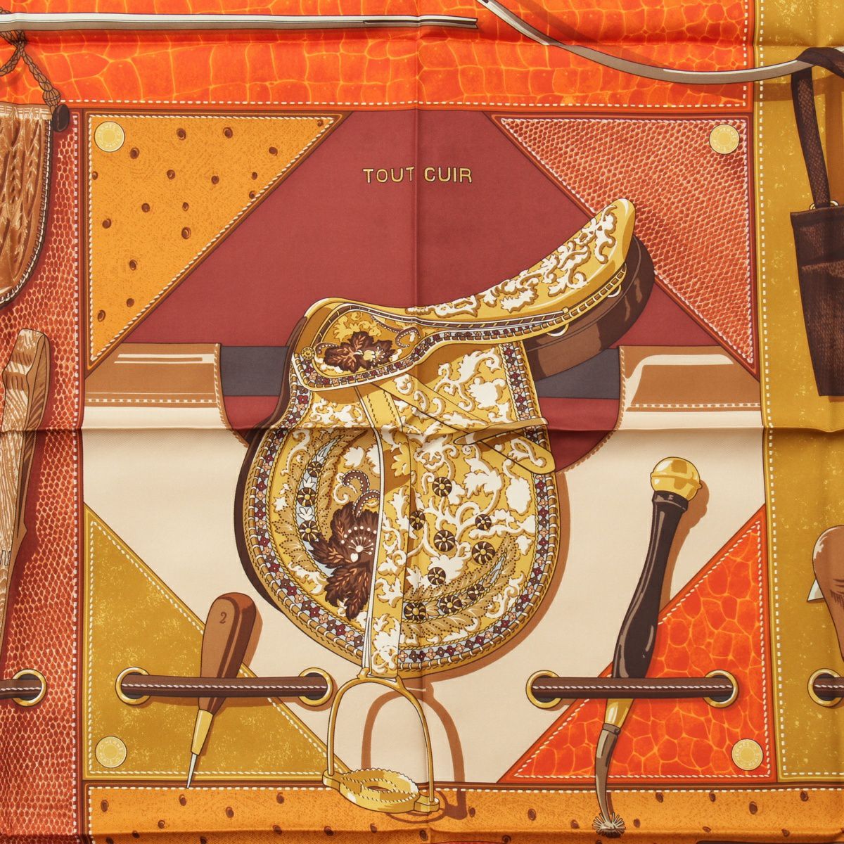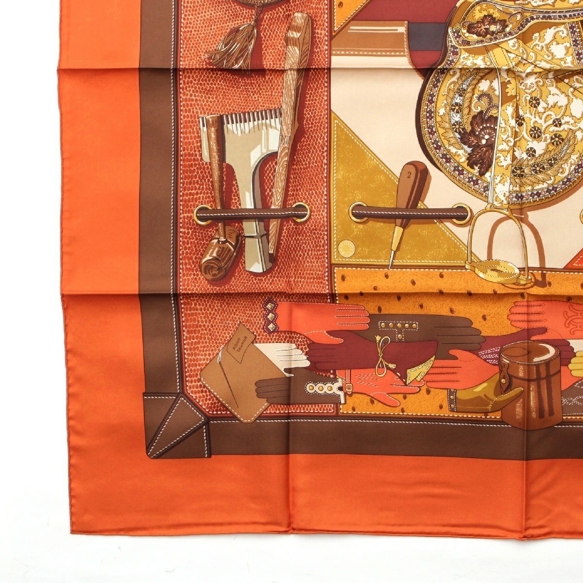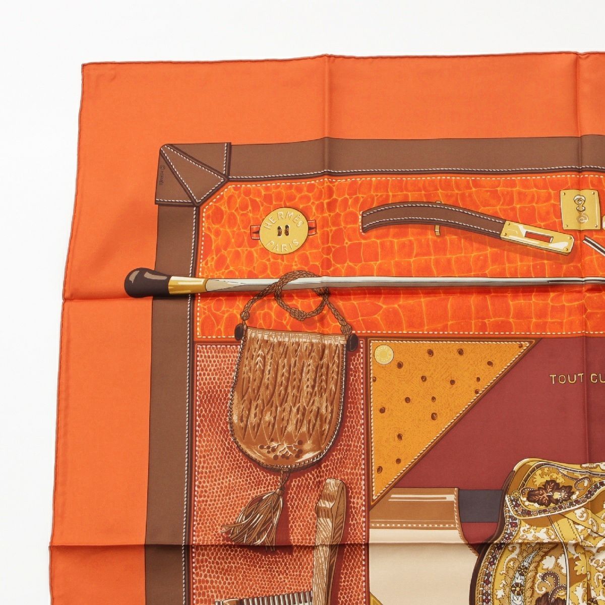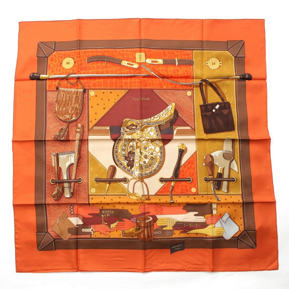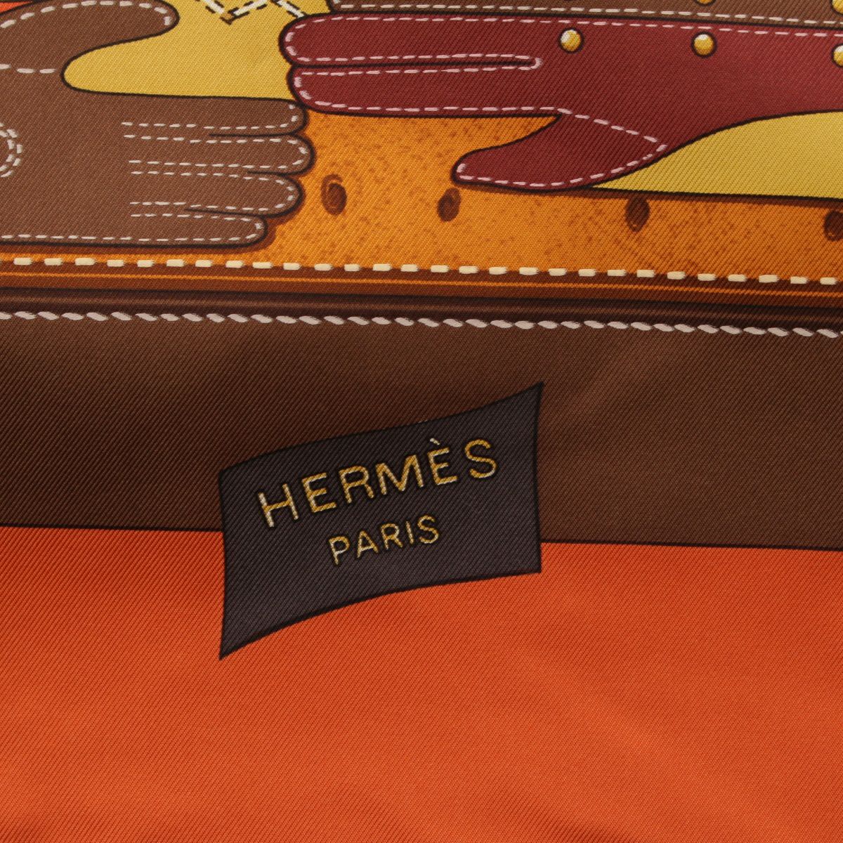 エルメス カレ90 シルク TOUT CUIR すべて皮 スカーフ バッグ グローブ モチーフ オレンジ ブラウン