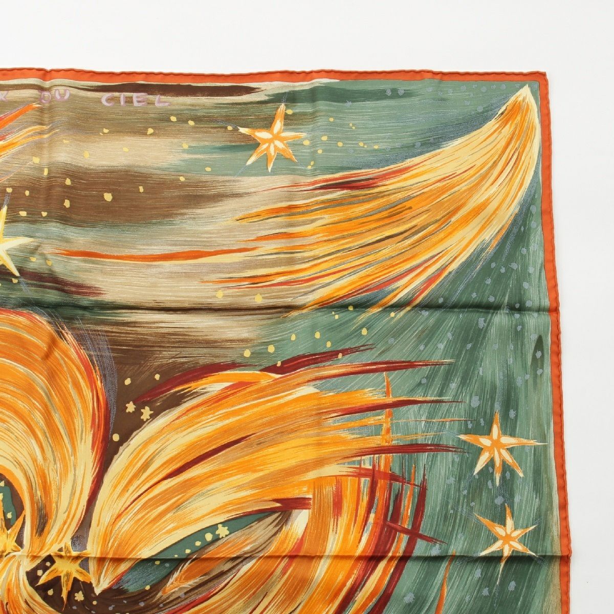 エルメス カレ90 シルク FEUX DU CIEL 天の火 スカーフ スター 星 絵画 オレンジ×ブルー
