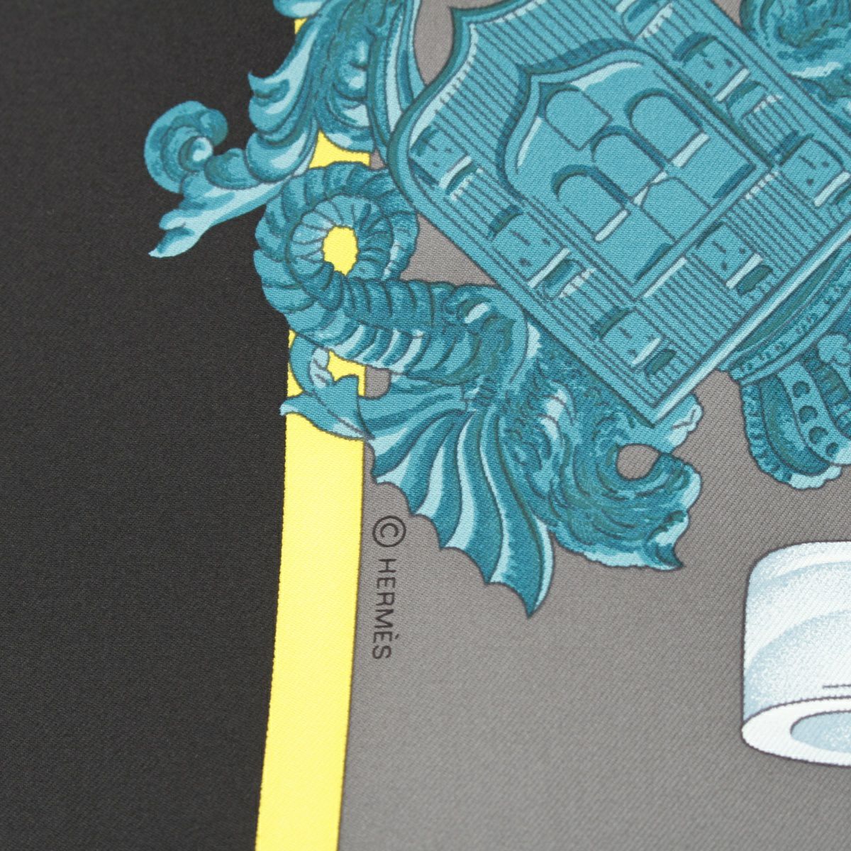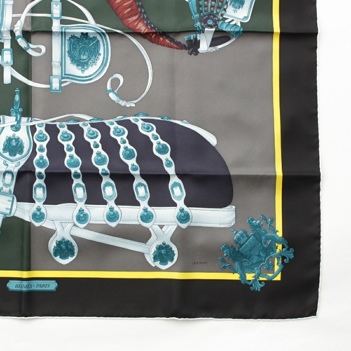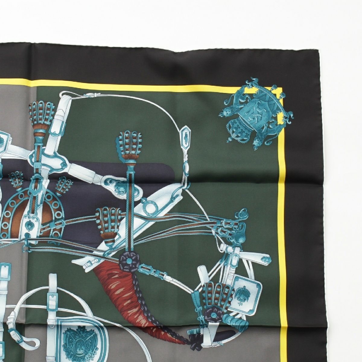 エルメス カレ90 シルク HARNAIS DE COUR 宮廷の馬具 スカーフ エンブレム ブラック×ブルー