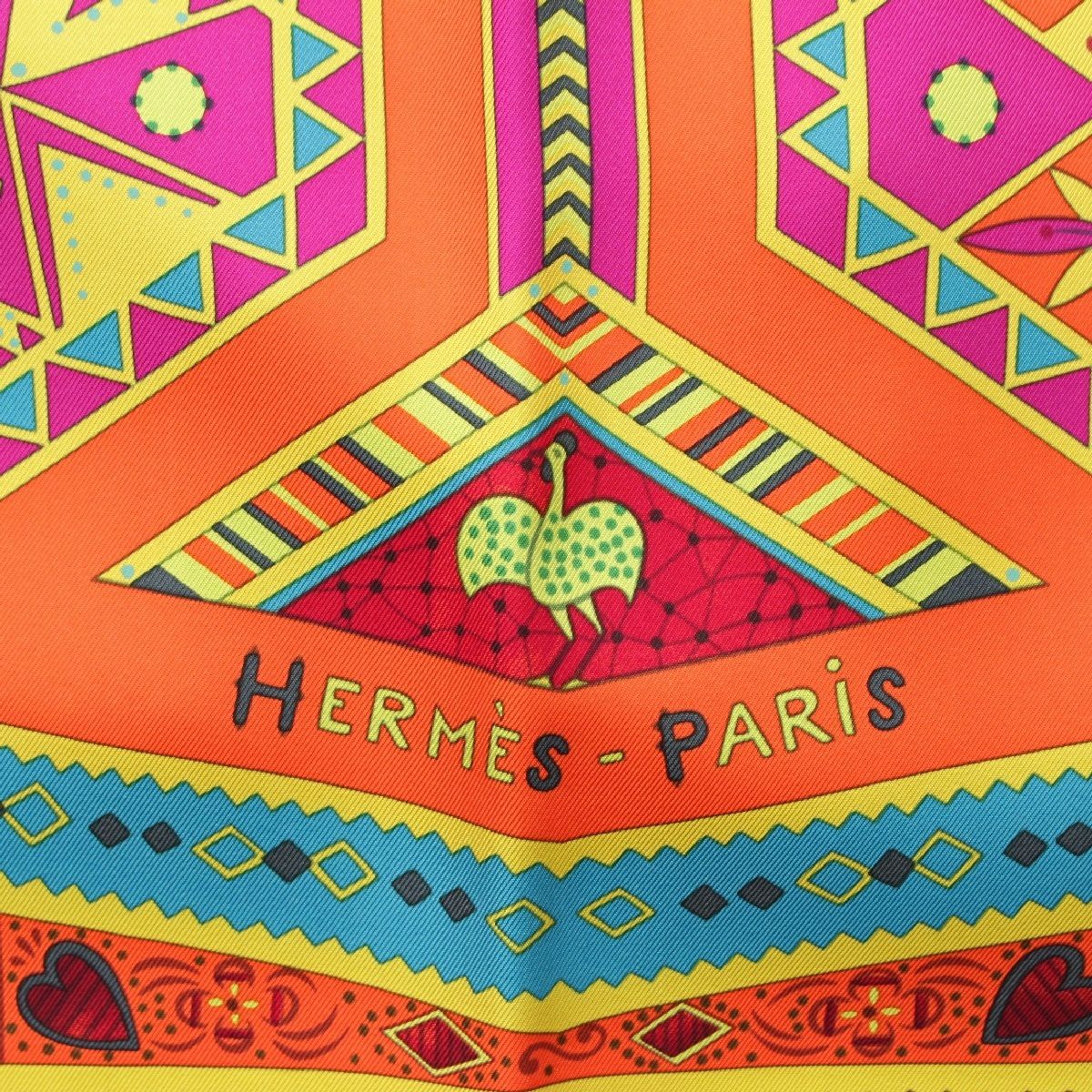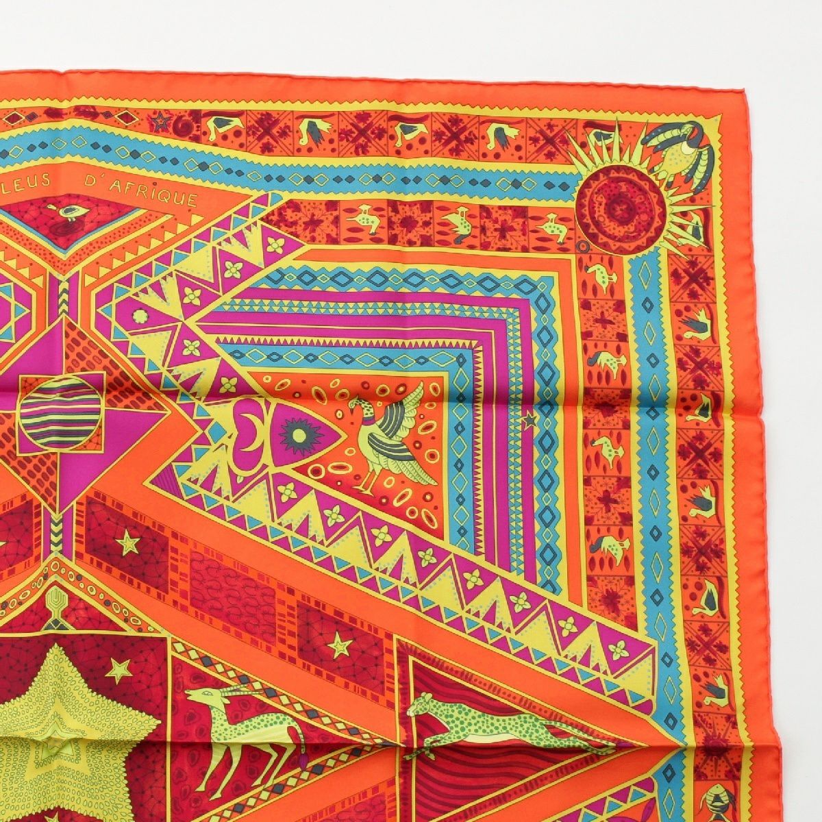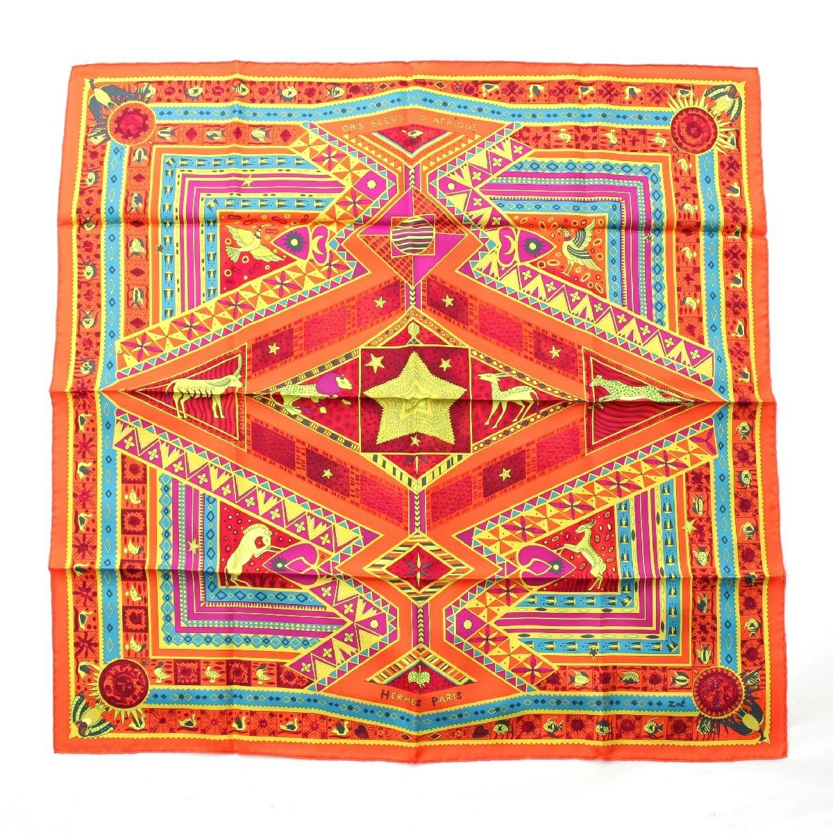 エルメス カレ90 シルク ORS BLEUS D'AFRIQUE アフリカの青い金 スカーフ アニマル オレンジ マルチカラー