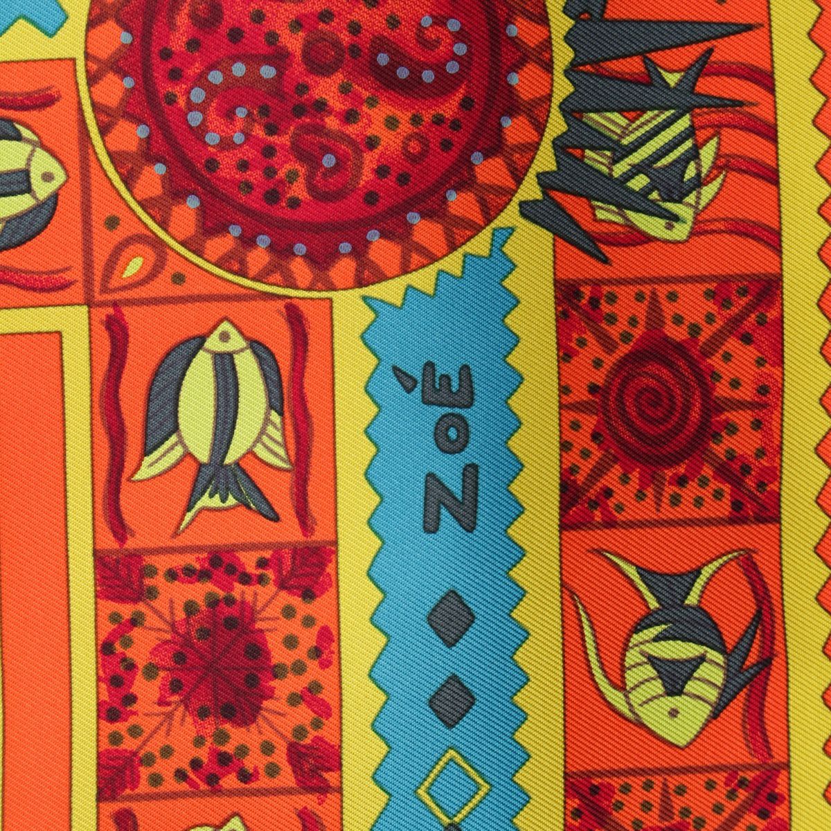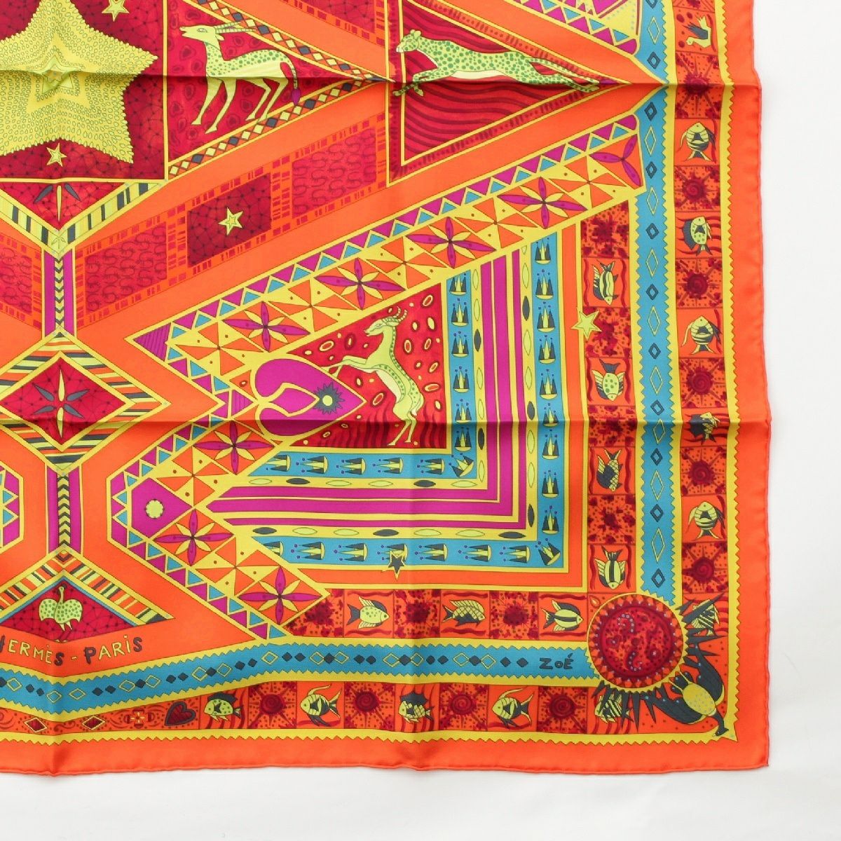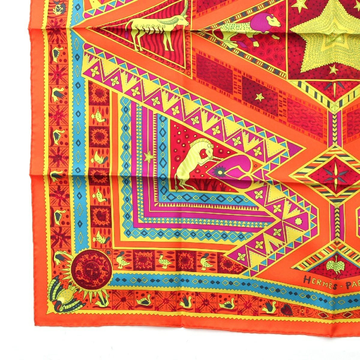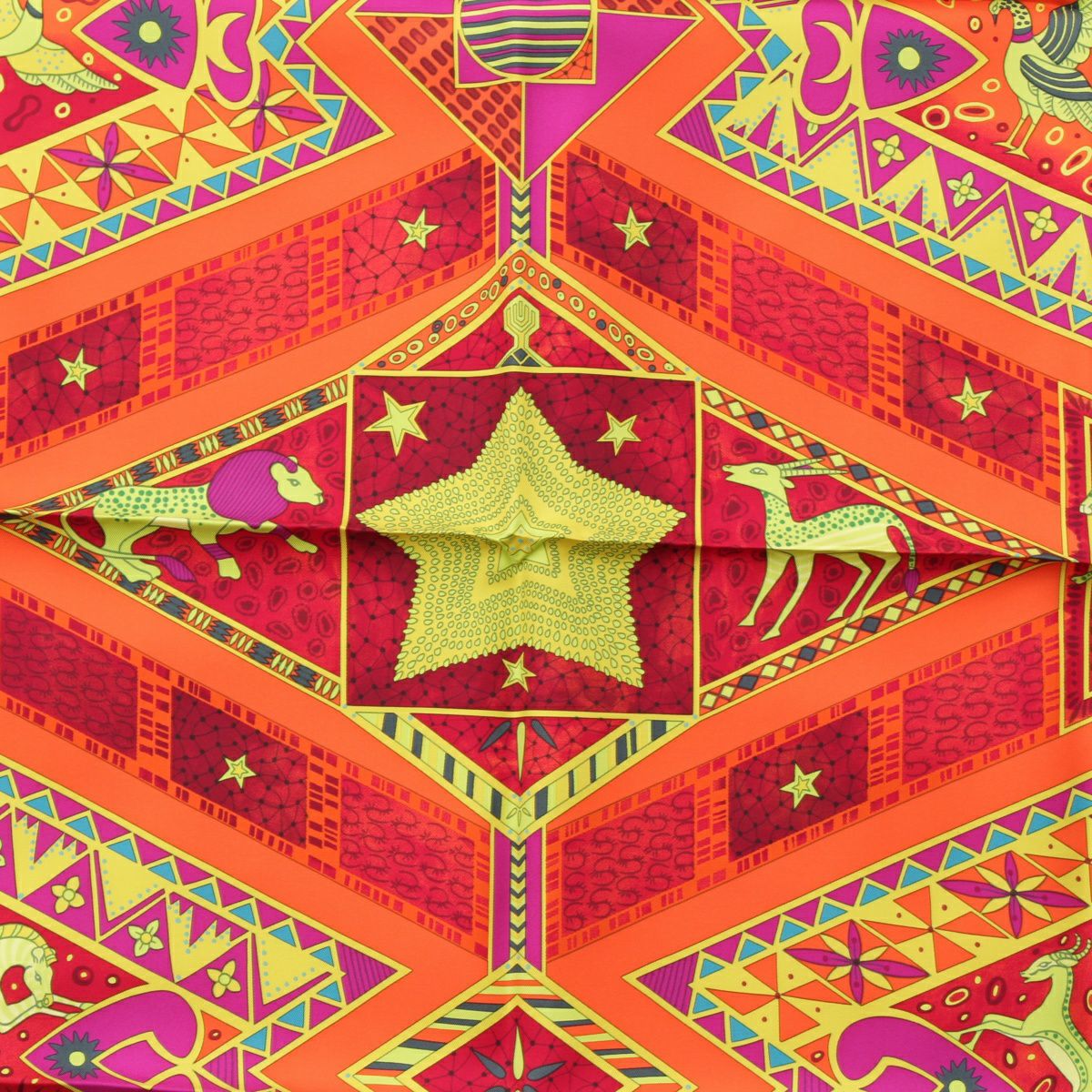 エルメス カレ90 シルク ORS BLEUS D'AFRIQUE アフリカの青い金 スカーフ アニマル オレンジ マルチカラー