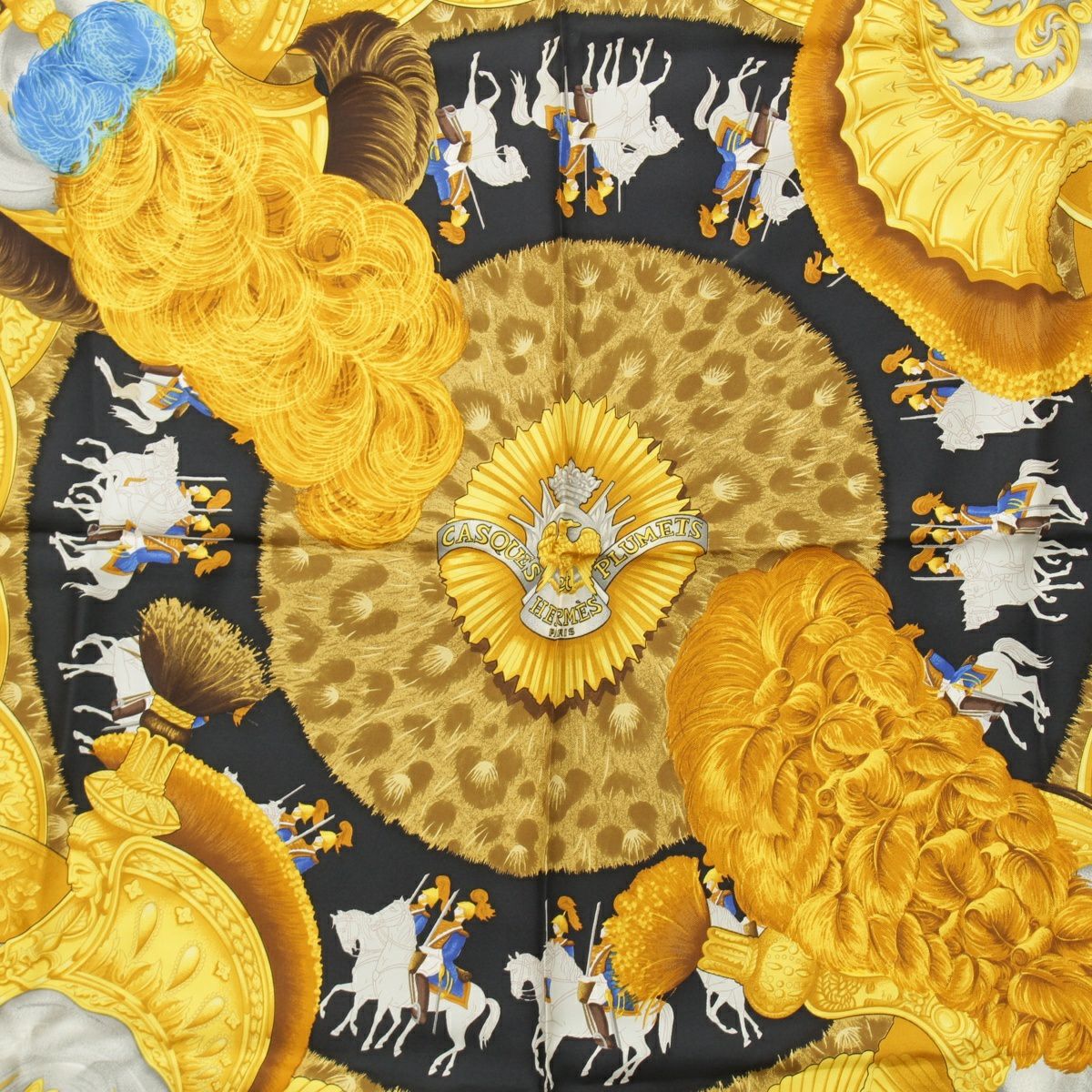 エルメス カレ90 CASQUES et PLUMETS 面貌のない兜 シルク スカーフ 馬 ゴールド ブラック