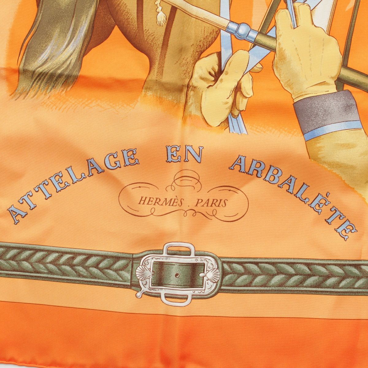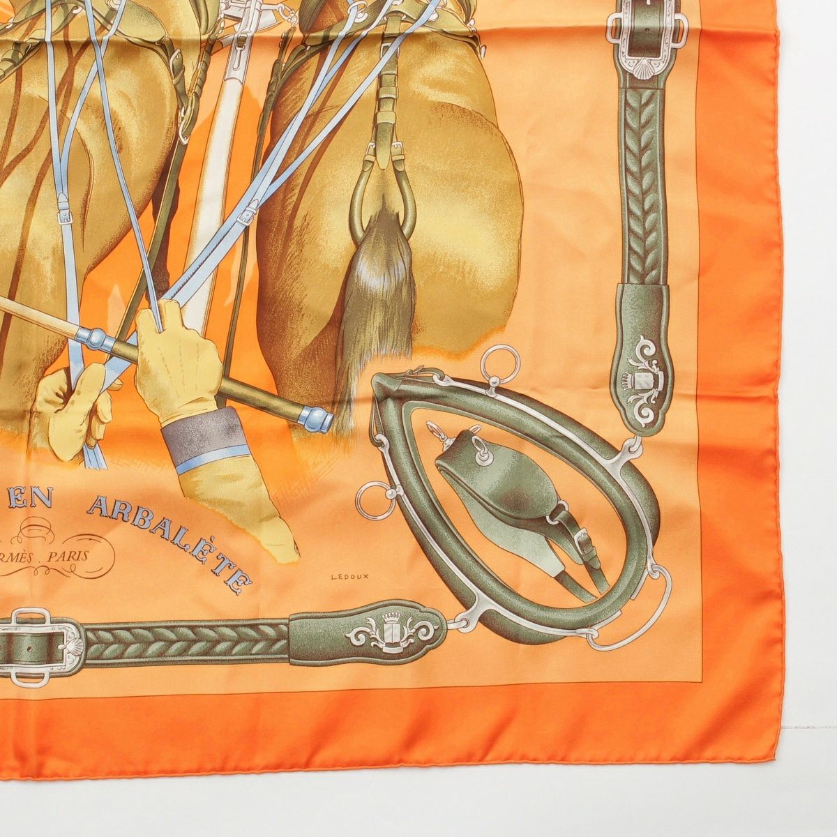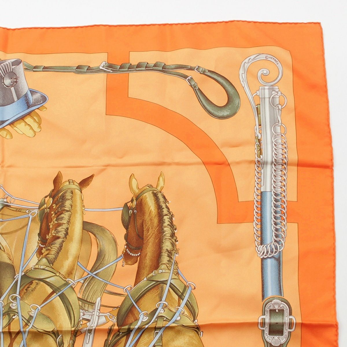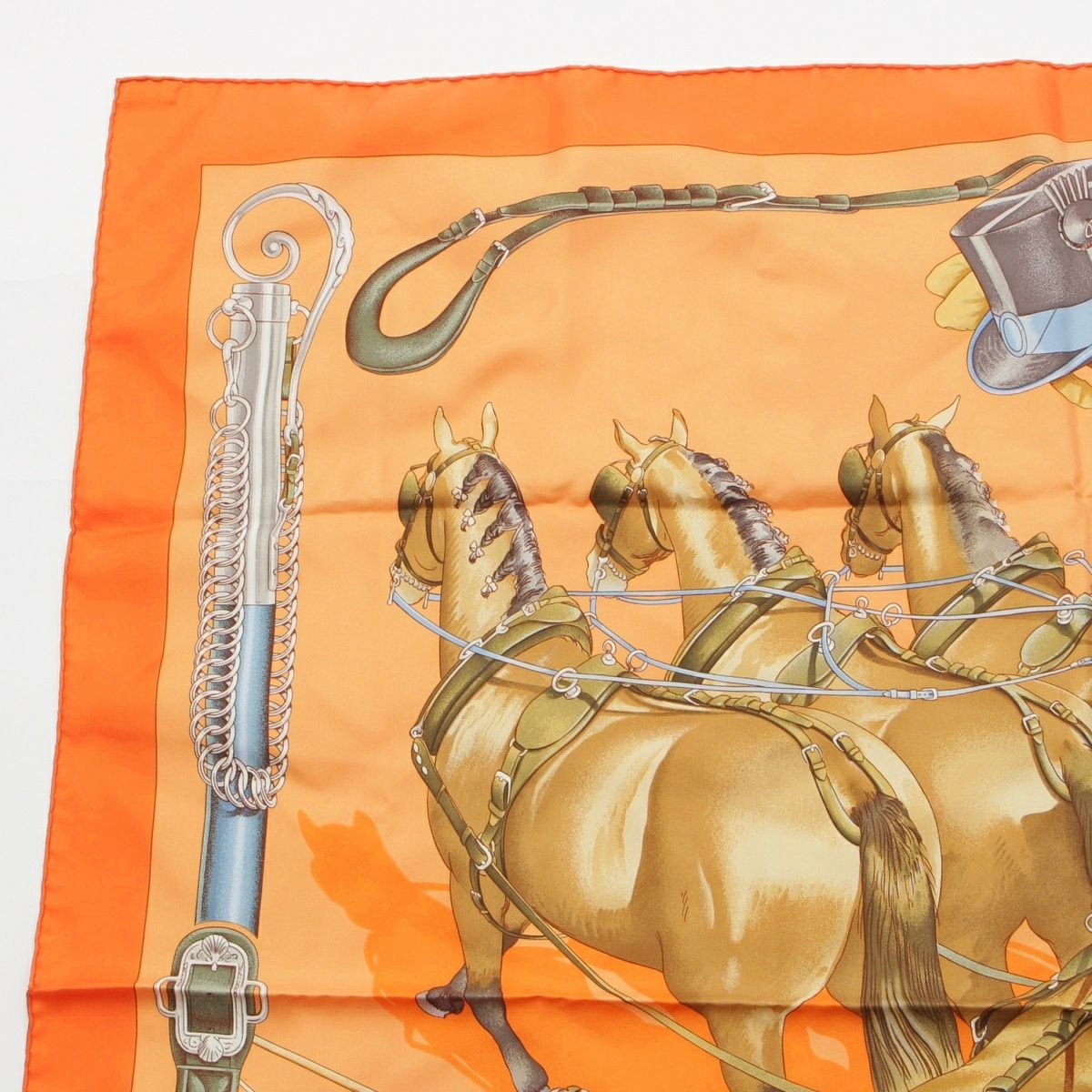 エルメス カレ90 シルク ATTELAGE EN ARBALETE 馬車弓形連結 スカーフ オレンジ系