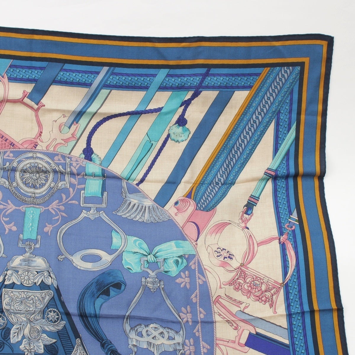エルメス カレジェアン カシミヤ シルク 140 Duo d'Etriers 鎧のデュオ 大判 スカーフ ブルー マルチカラー