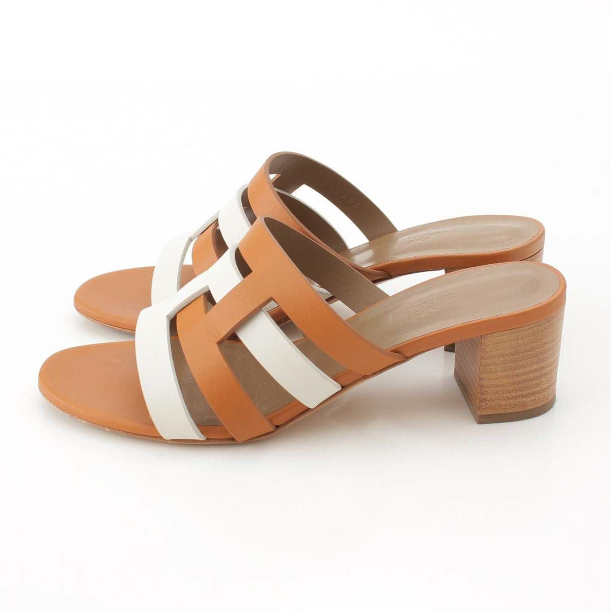 エルメス Hermes Amica アミカ レザー Hモチーフ サンダル ミュール ホワイト×ブラウン 37 1/2