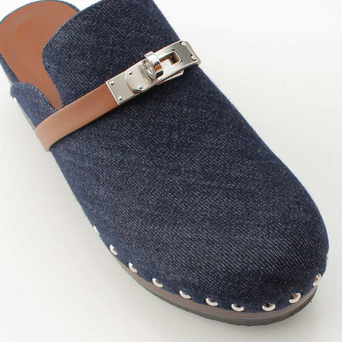 エルメス カルロッタ ウッド デニム スタッズ 厚底 サボサンダル シューズ ブルー 37