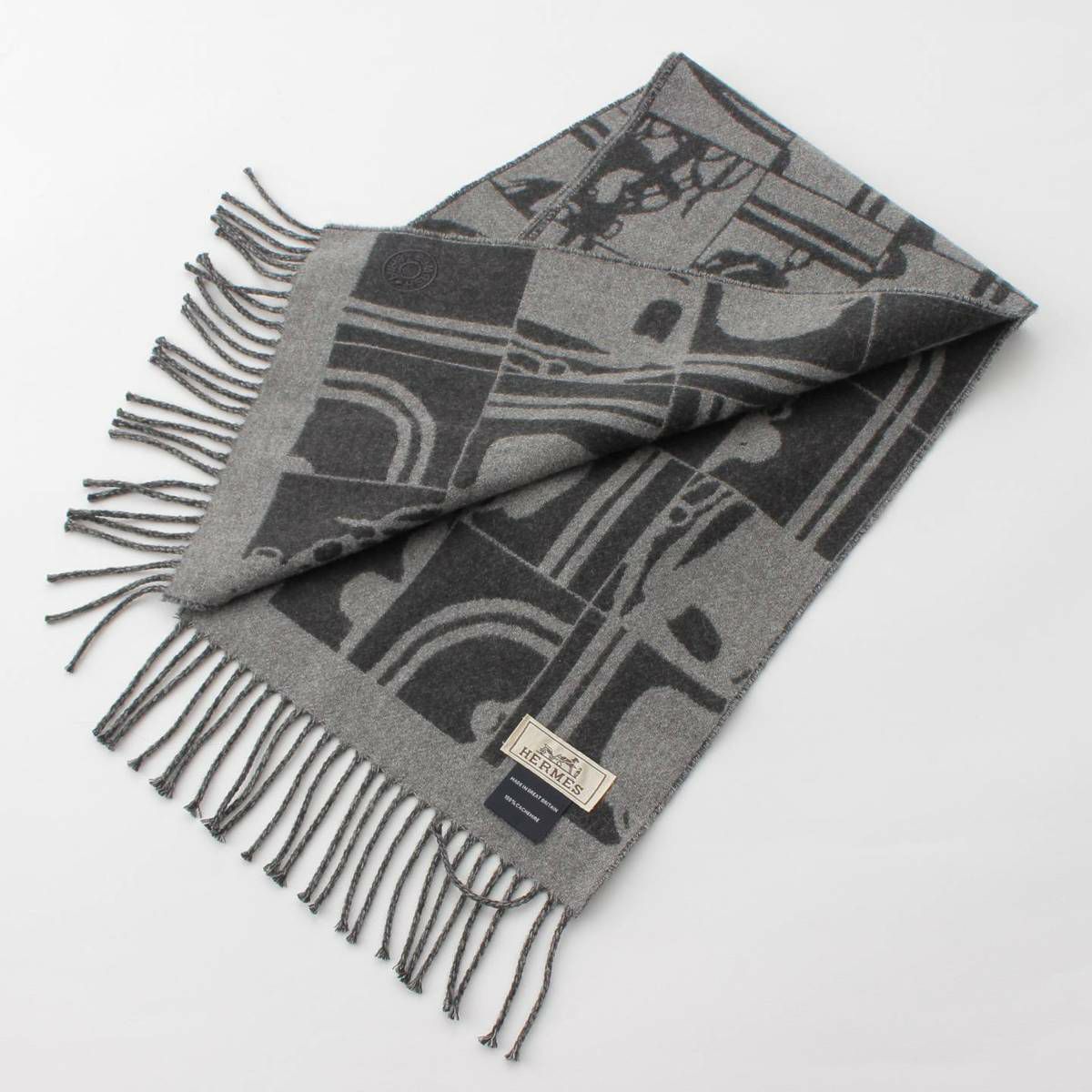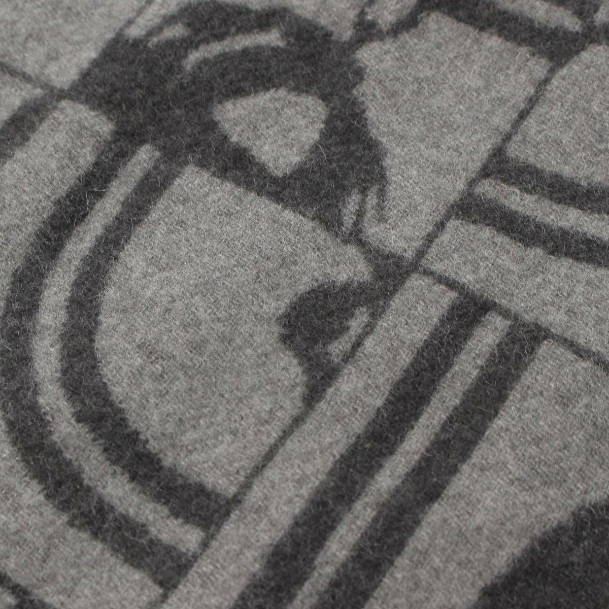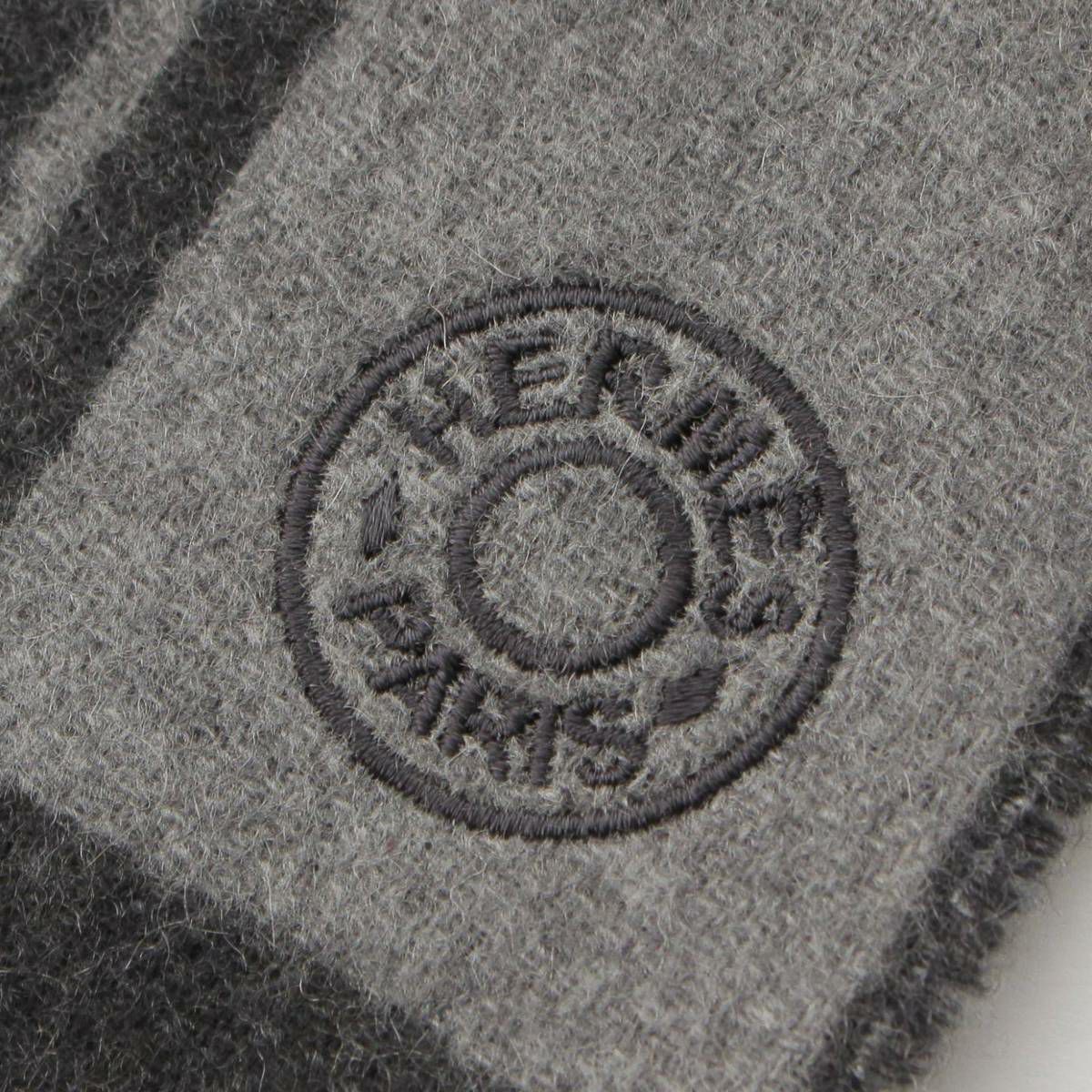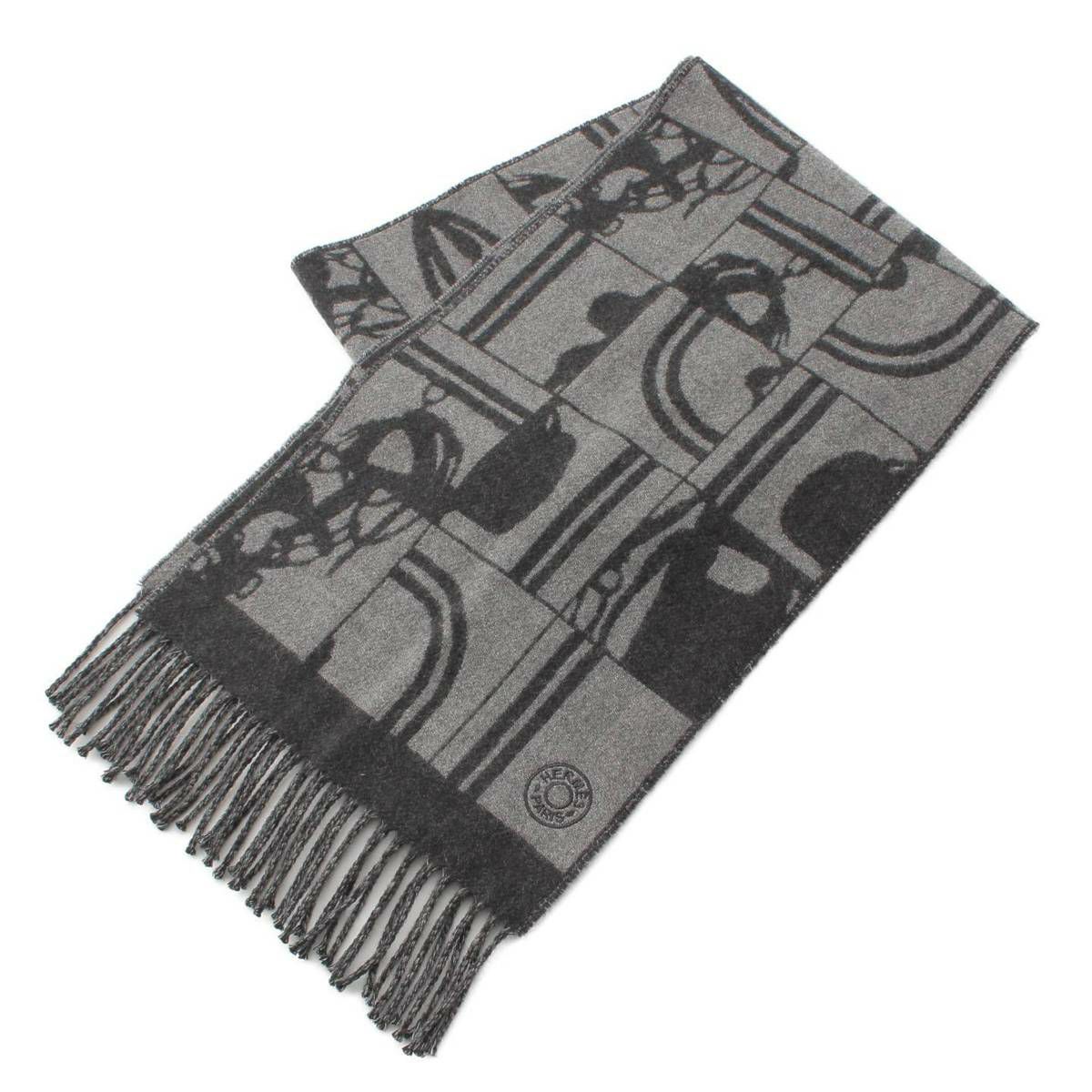 エルメス Brides de Gala ブリッド ドゥ ガラ セリエ ロゴ カシミヤ フリンジ マフラー グレー