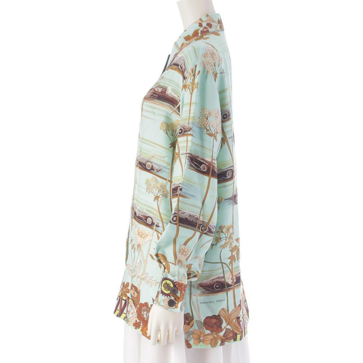 エルメス シルク LES BOLIDES柄 シェルボタン 長袖 プリント シャツ トップス グリーン 38