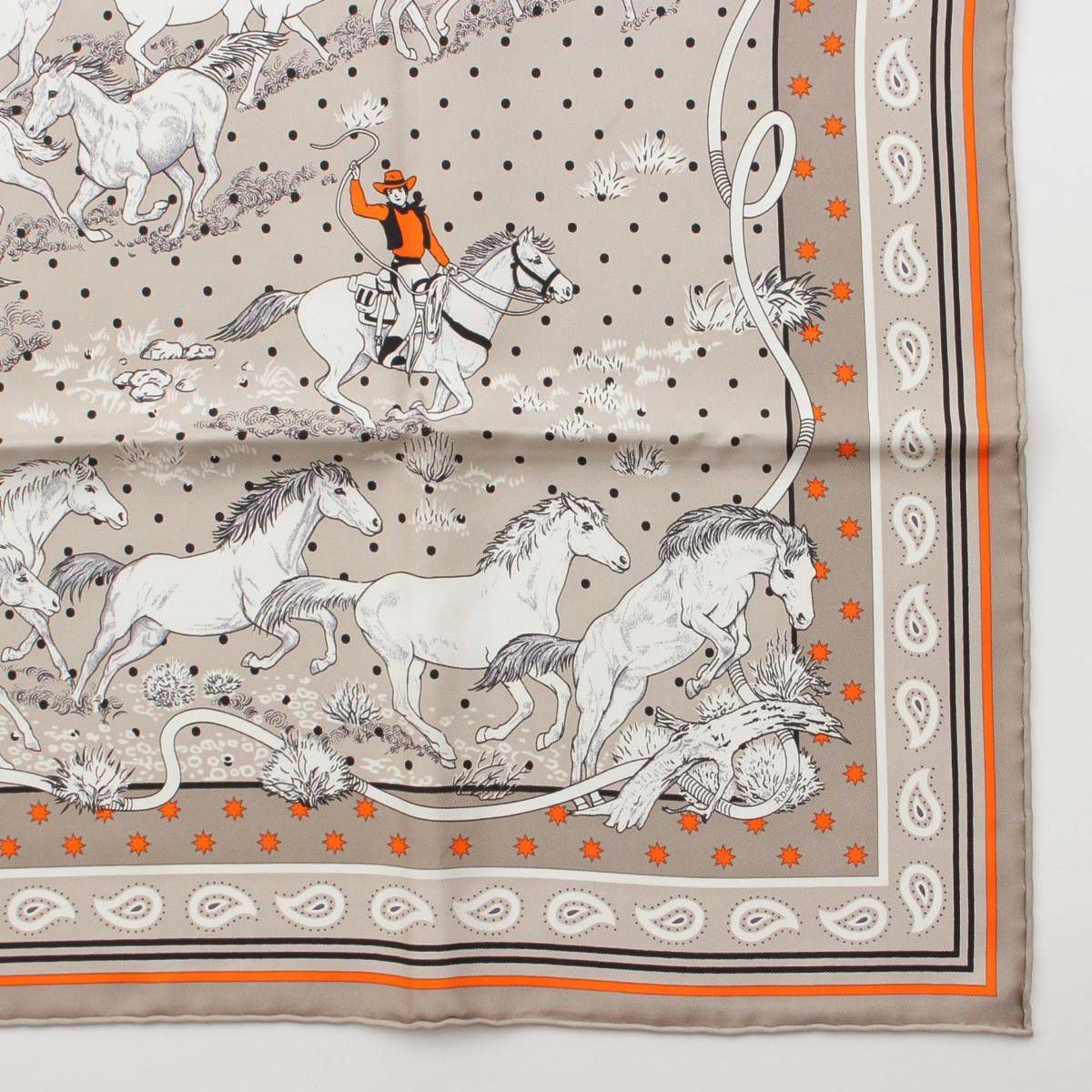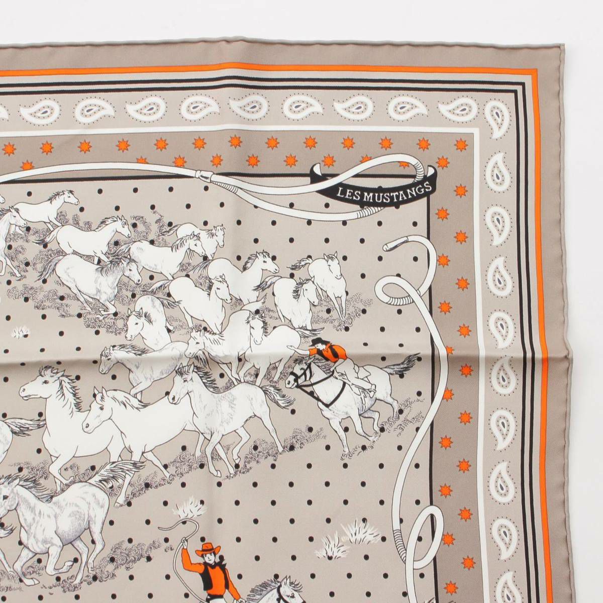 エルメス カレ55 シルク スカーフ Les Mustangs Bandana 野生馬 オレンジ ×グレー