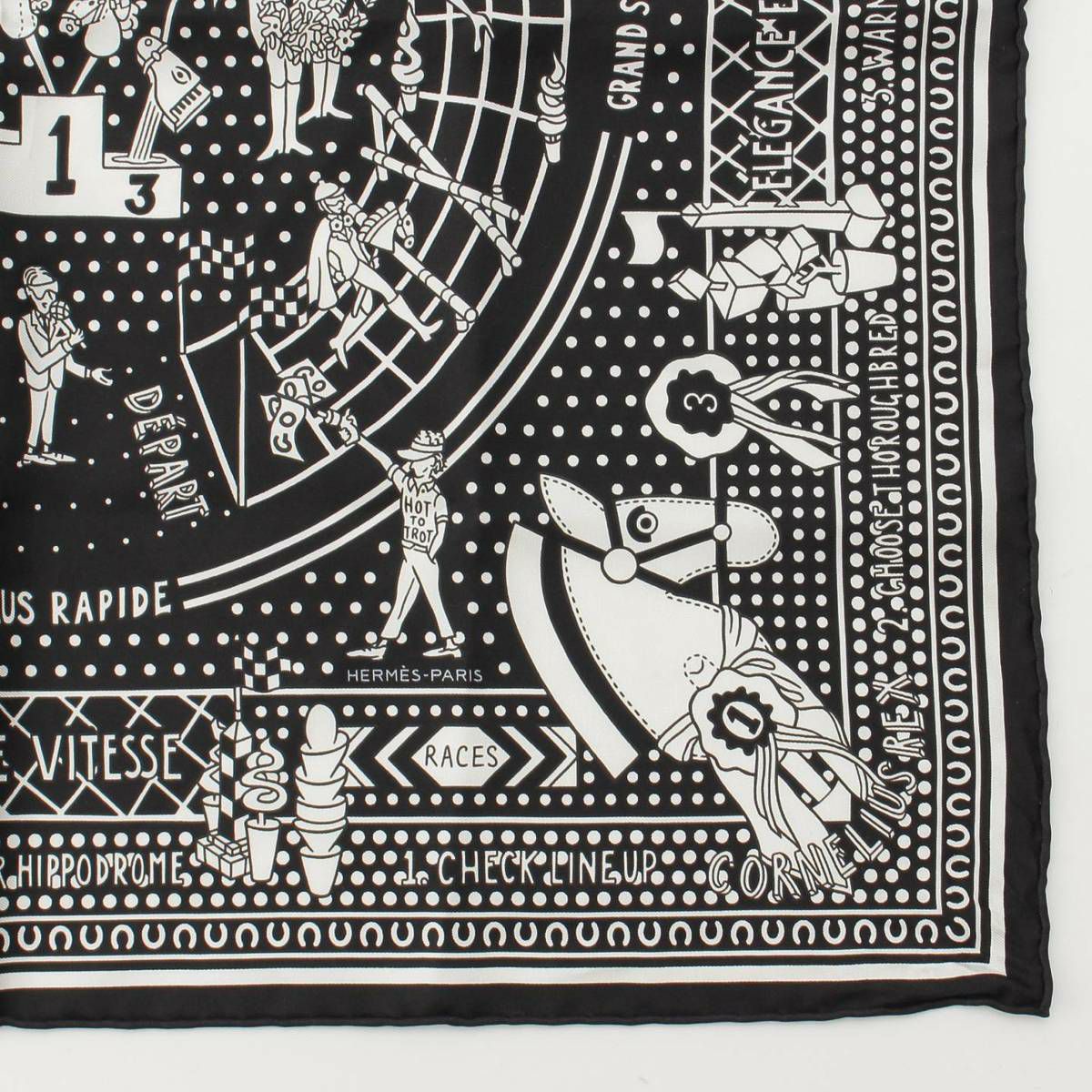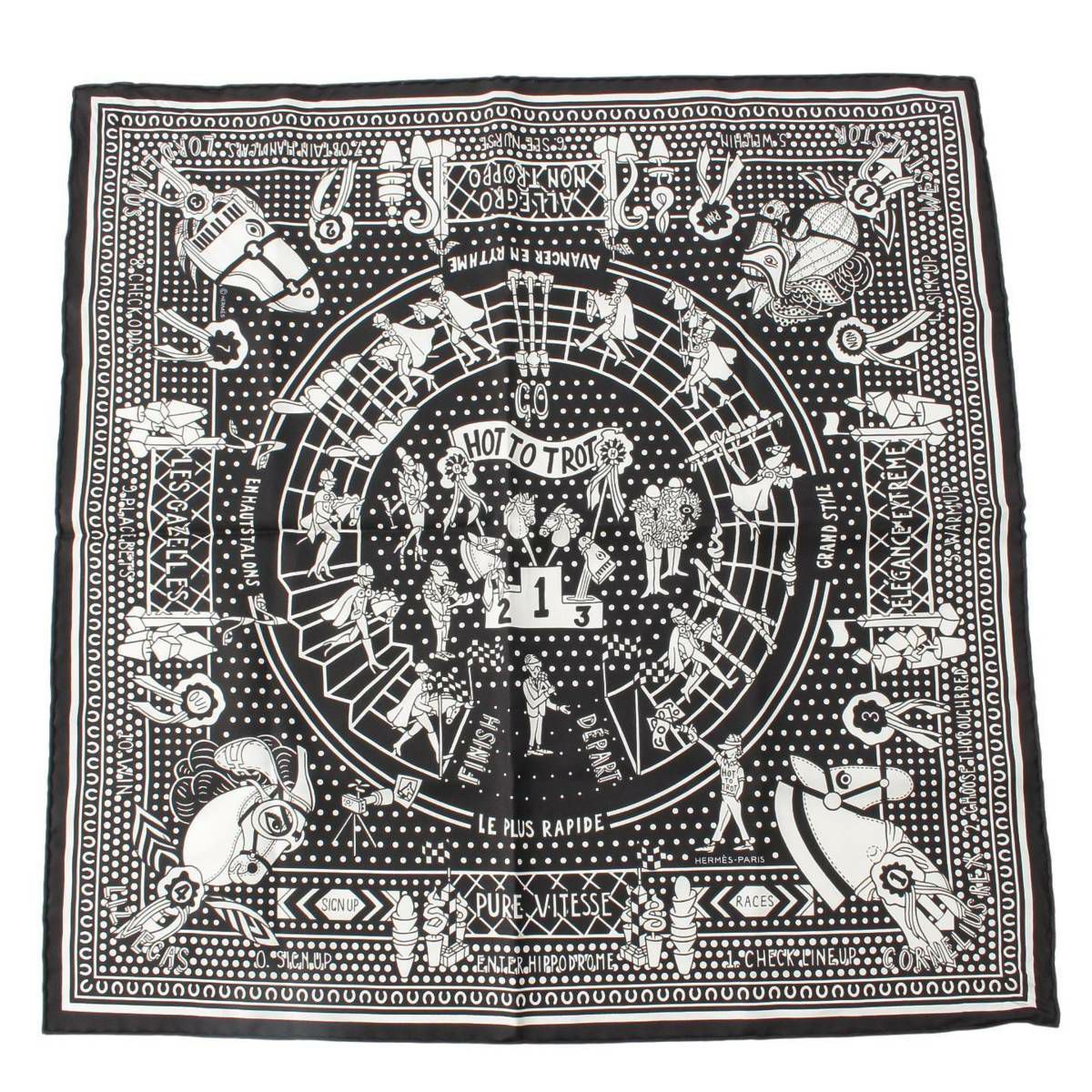エルメス Hermes シルクバンダナ カレ55 スカーフ HOT TO TROP 馬 競技 表彰台 ブラック ホワイト