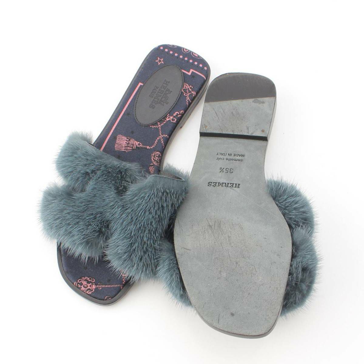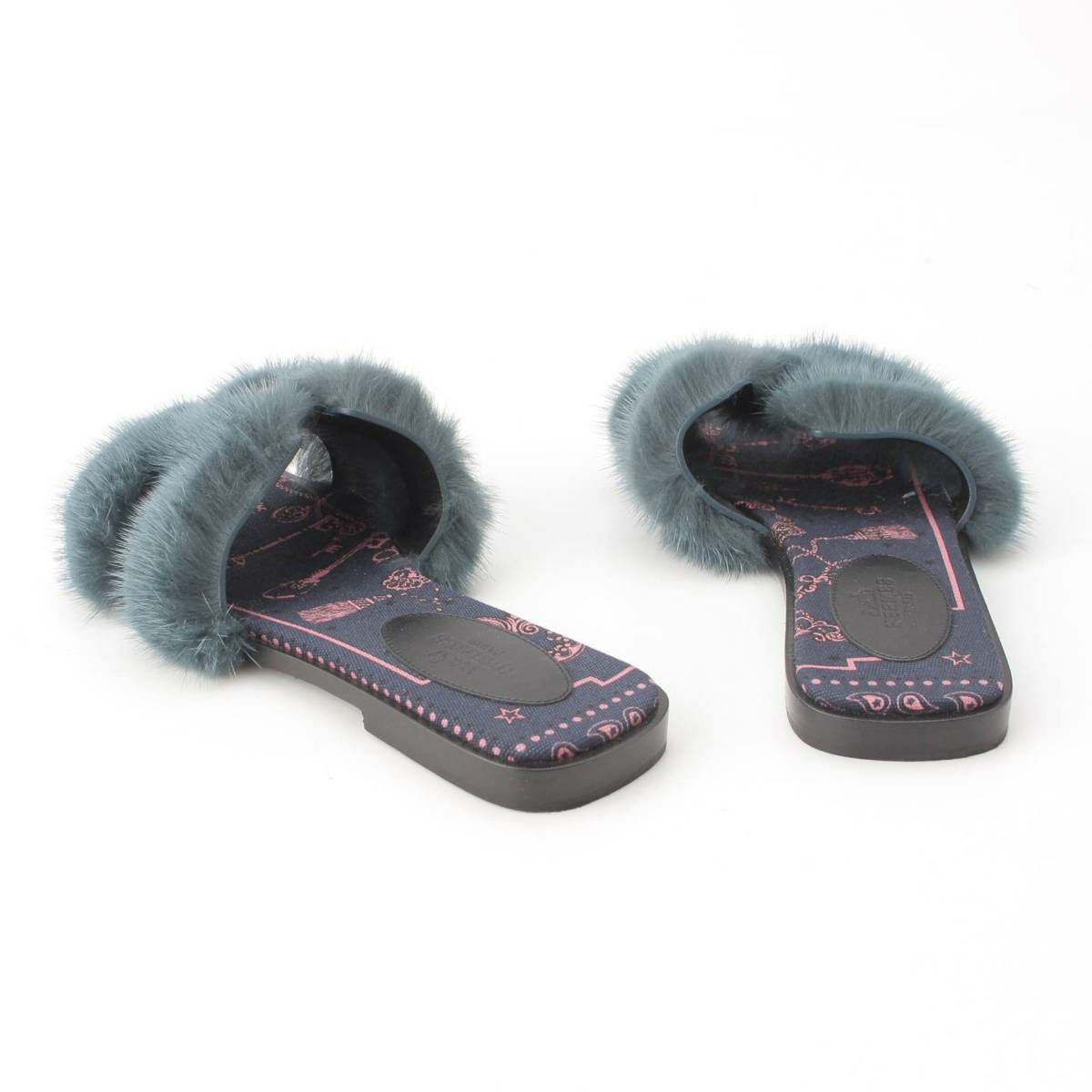 エルメス オラン Hモチーフ ミンクファー フラットサンダル ミュール ネイビー 35 1/2