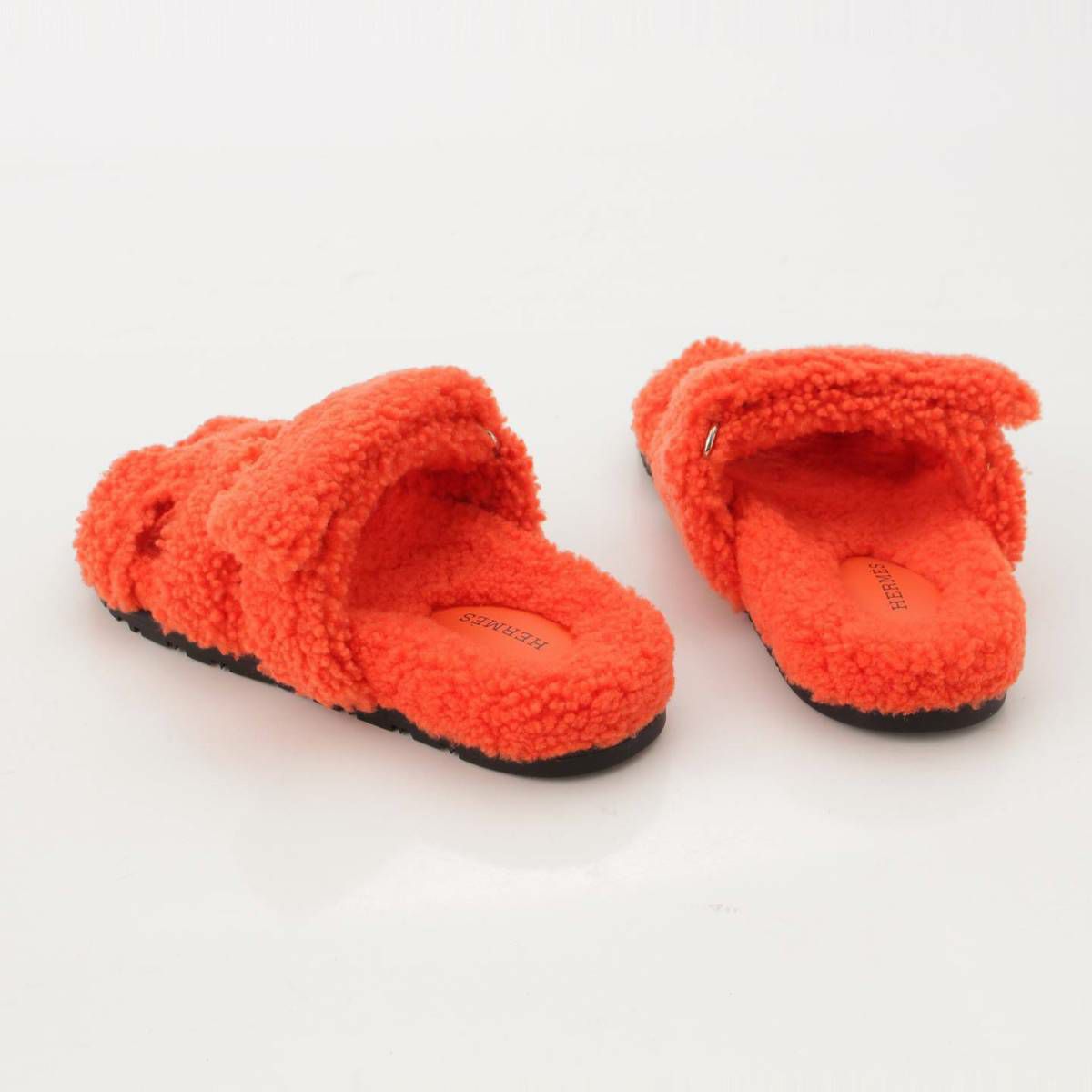 エルメス シプレ マジックテープ ベルト ムートン ボア サンダル シューズ オレンジ 36