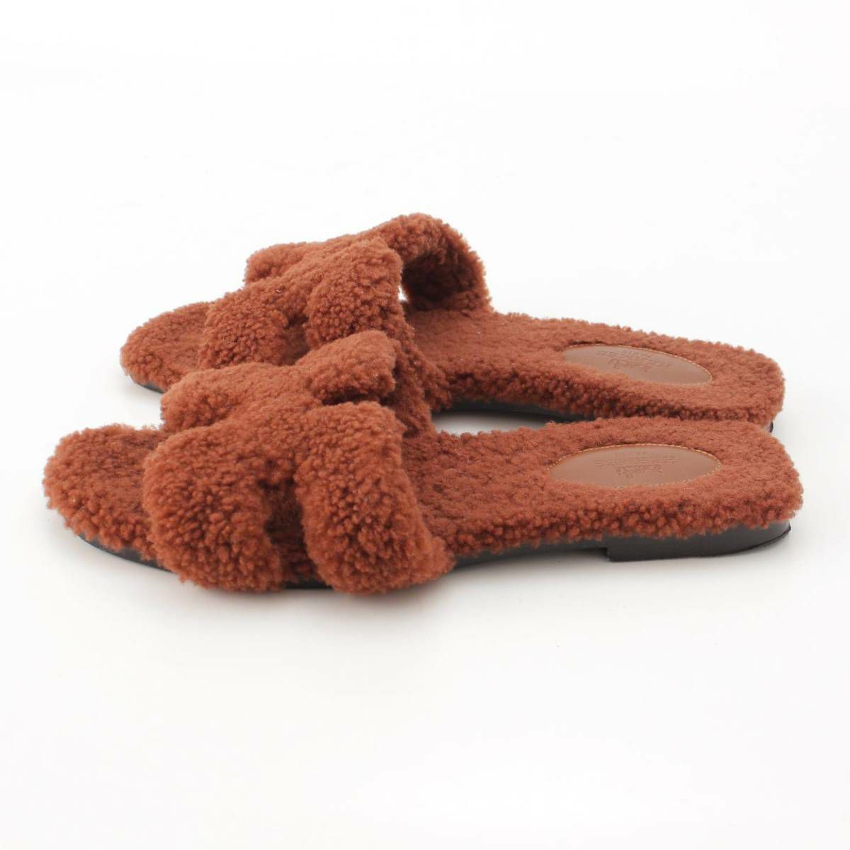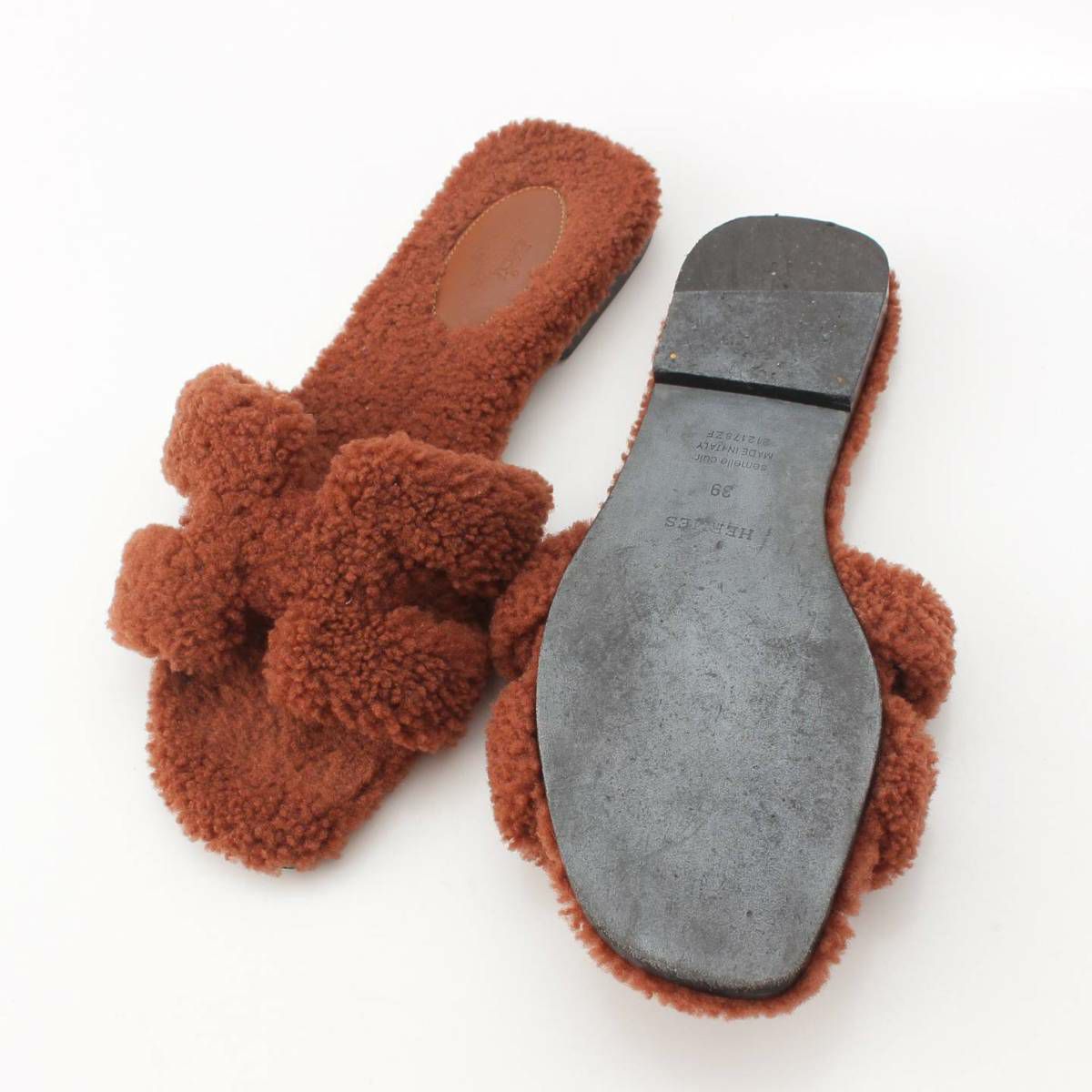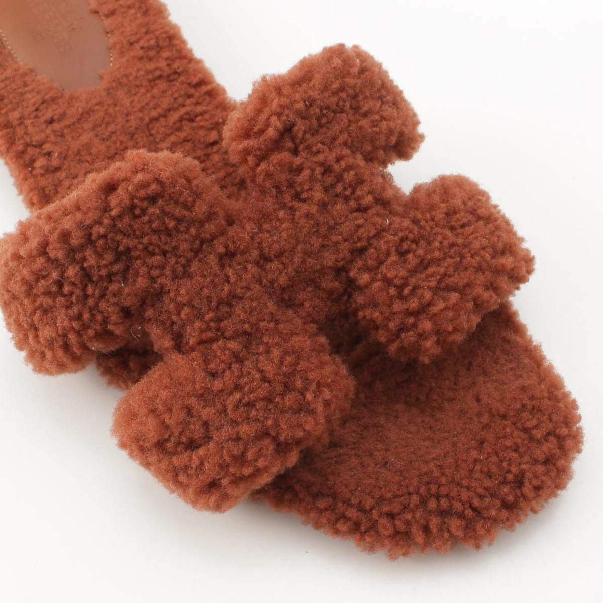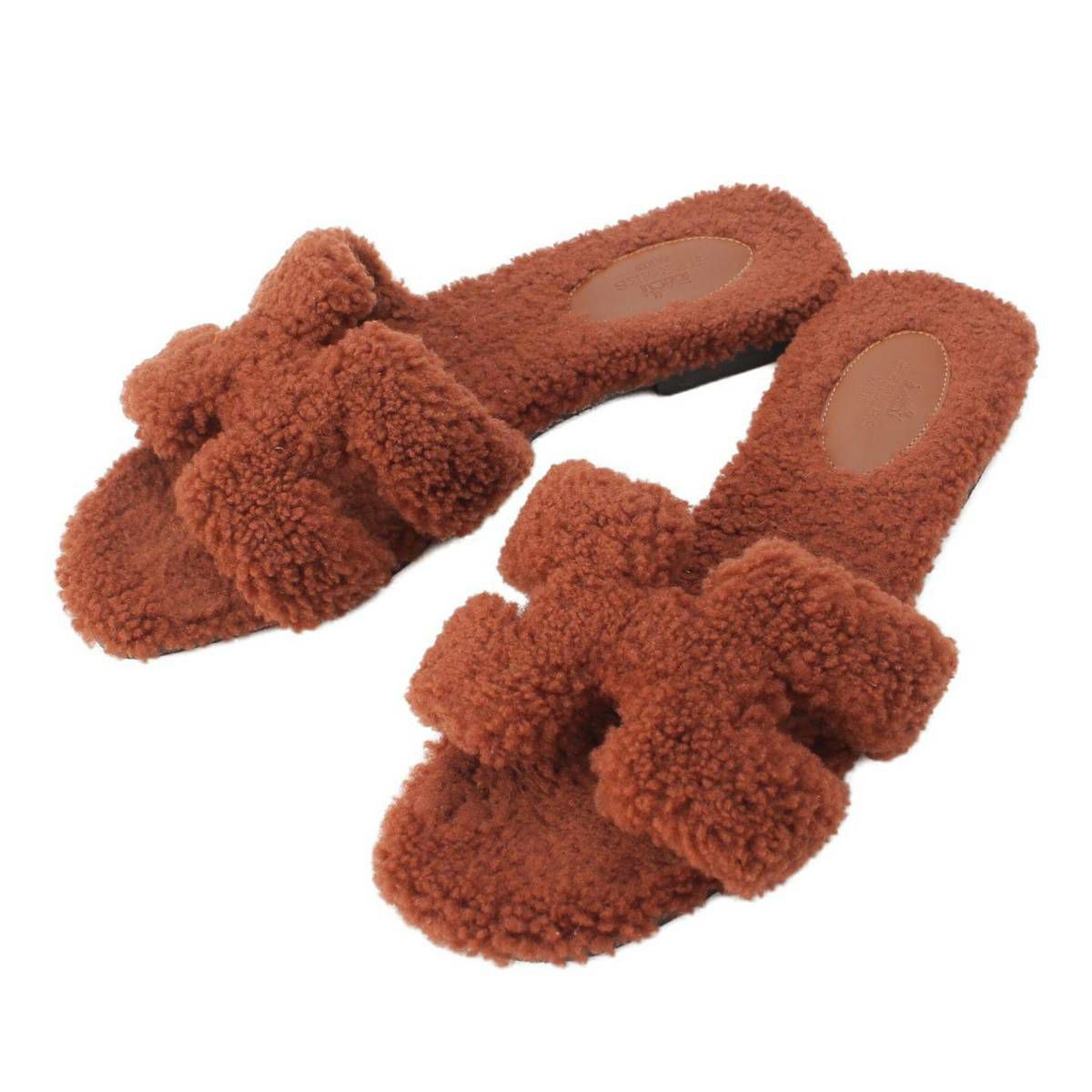 エルメス Hermes オラン Hモチーフ ムートン ファー フラット サンダル ミュール ブラウン 39