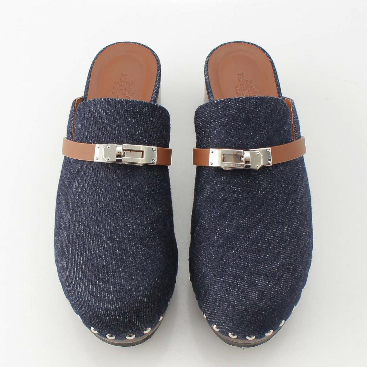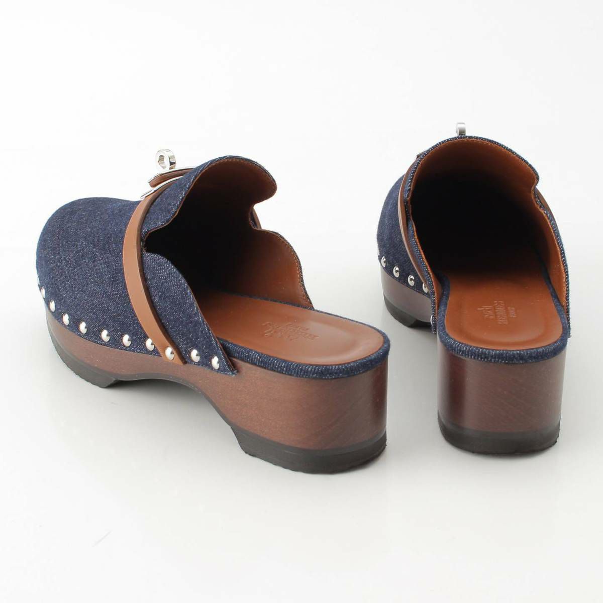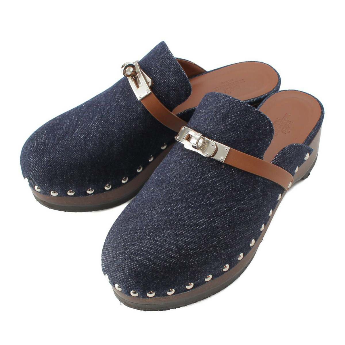 エルメス カルロッタ ウッド デニム スタッズ 厚底 サボサンダル シューズ ブルー 37