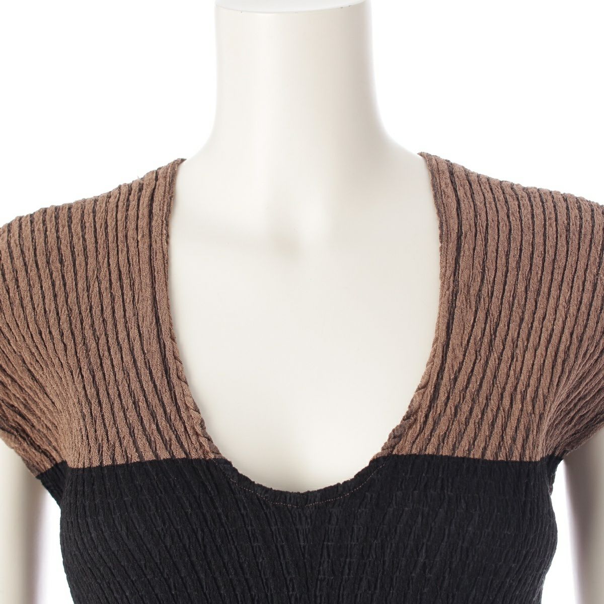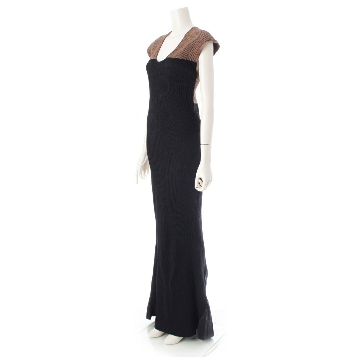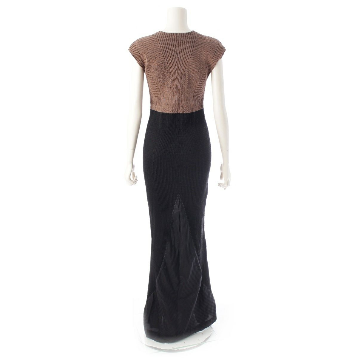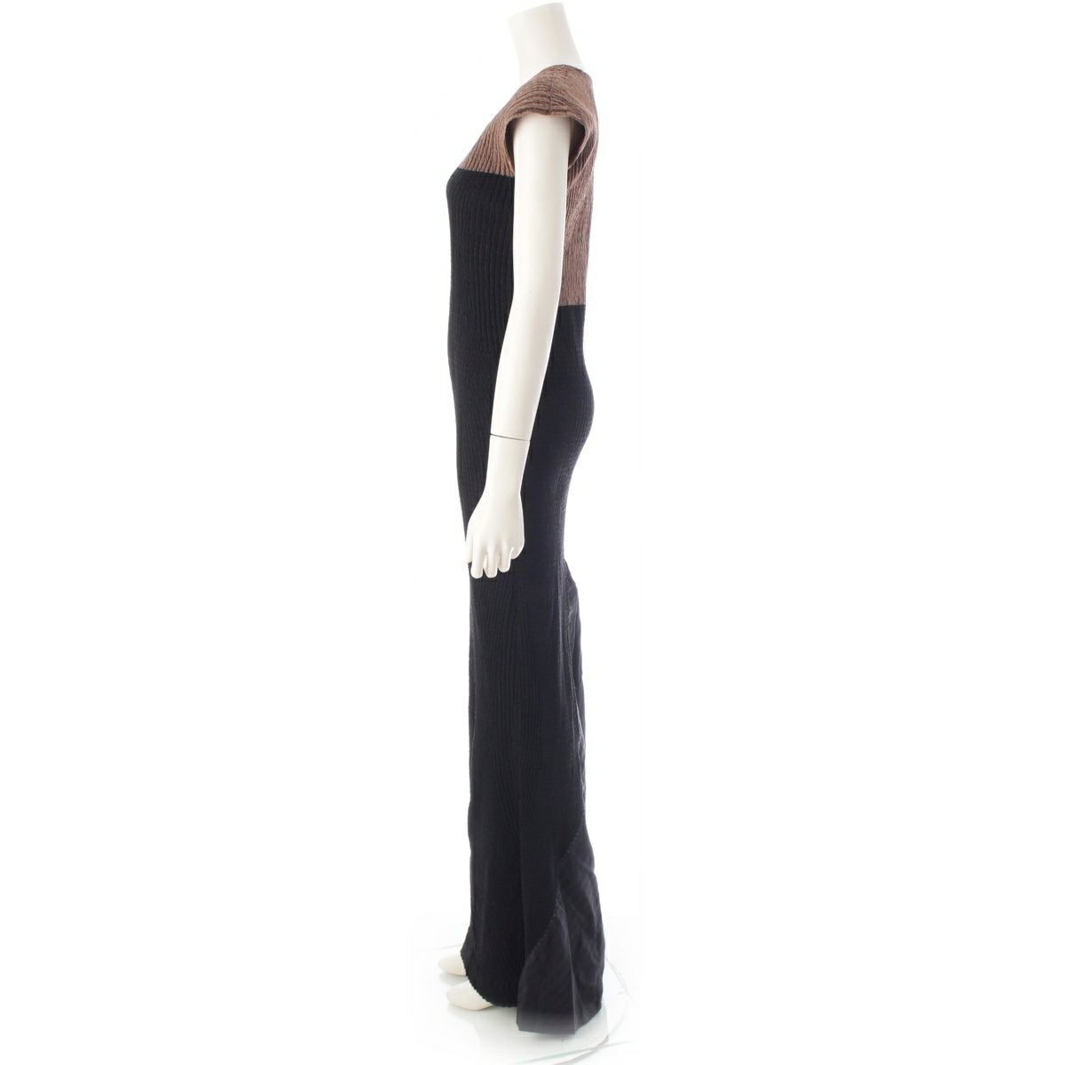イッセイミヤケ シルク昆 ウネウネ プリーツデザイン 切替 ニット ノースリーブ ロング ワンピース ドレス IM23FH525 ブラウン ブラック 2