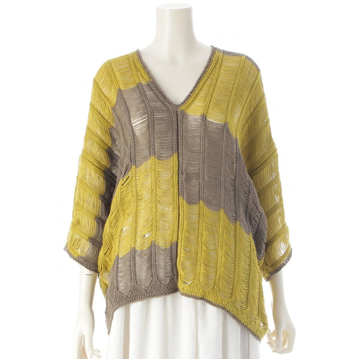 ダメージ箇所: 表面右下、背面左袖に編み目の伸び、保管臭のようなニオイ