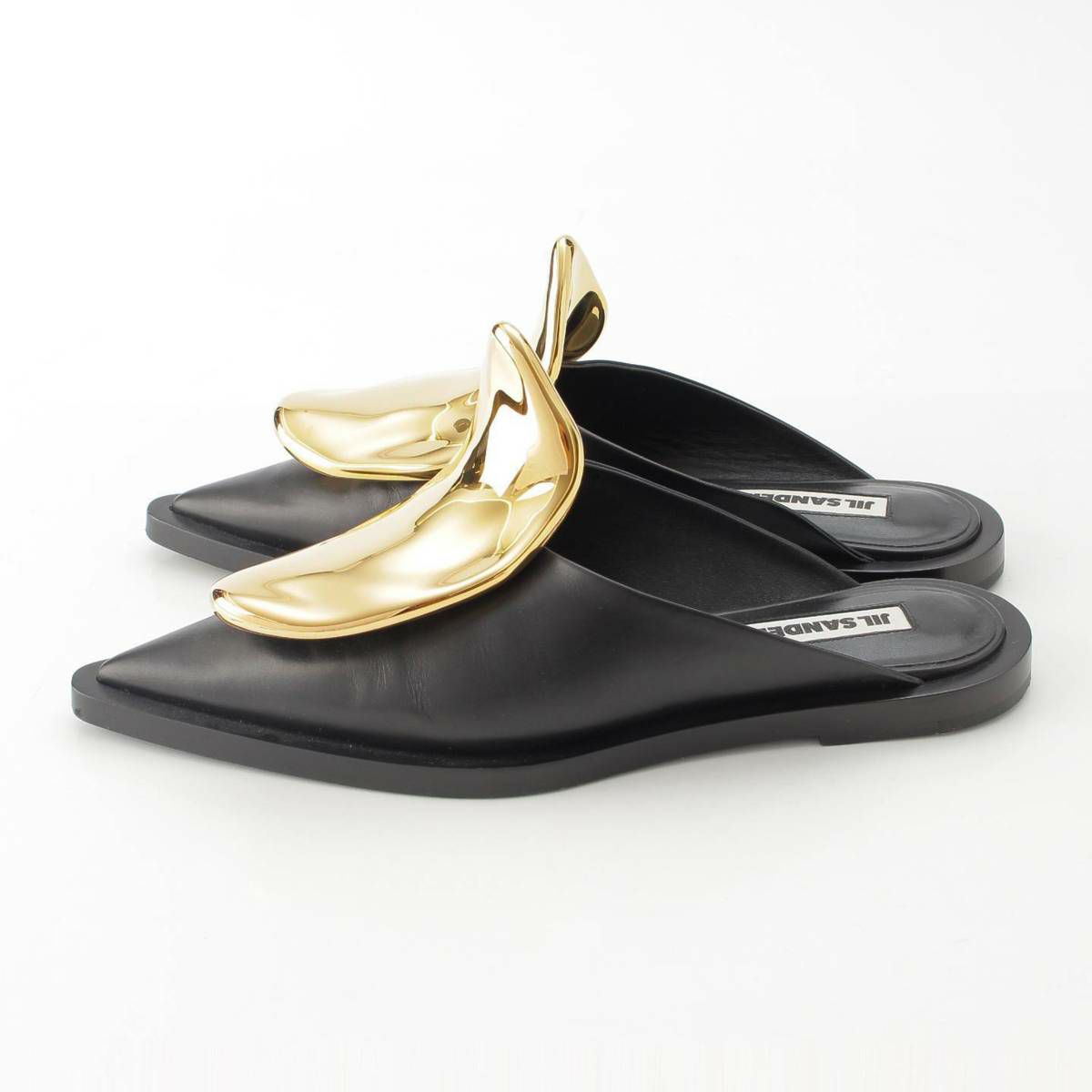 ジルサンダー Jil Sander メタルプレート レザー フラット ミュール サンダル JS38250A ブラック×ゴールド 38