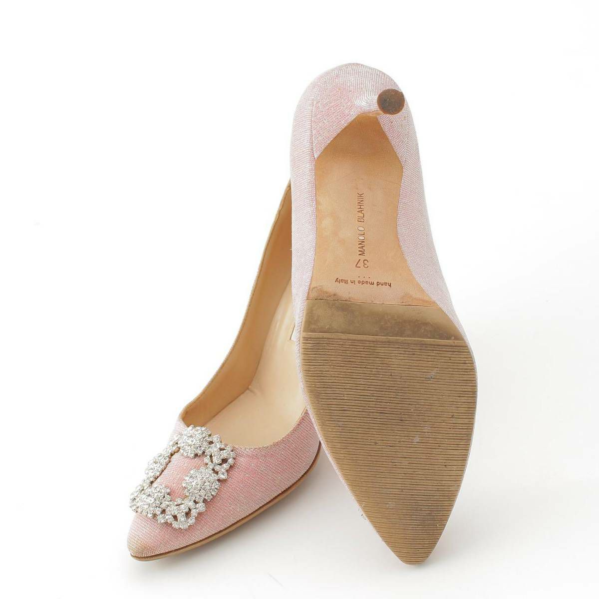 マノロブラニク Manolo Blahnik ハンギシ ビジューバックル メッシュ ポインテッドトゥ ヒール パンプス ピンク