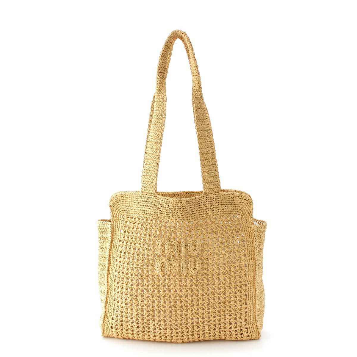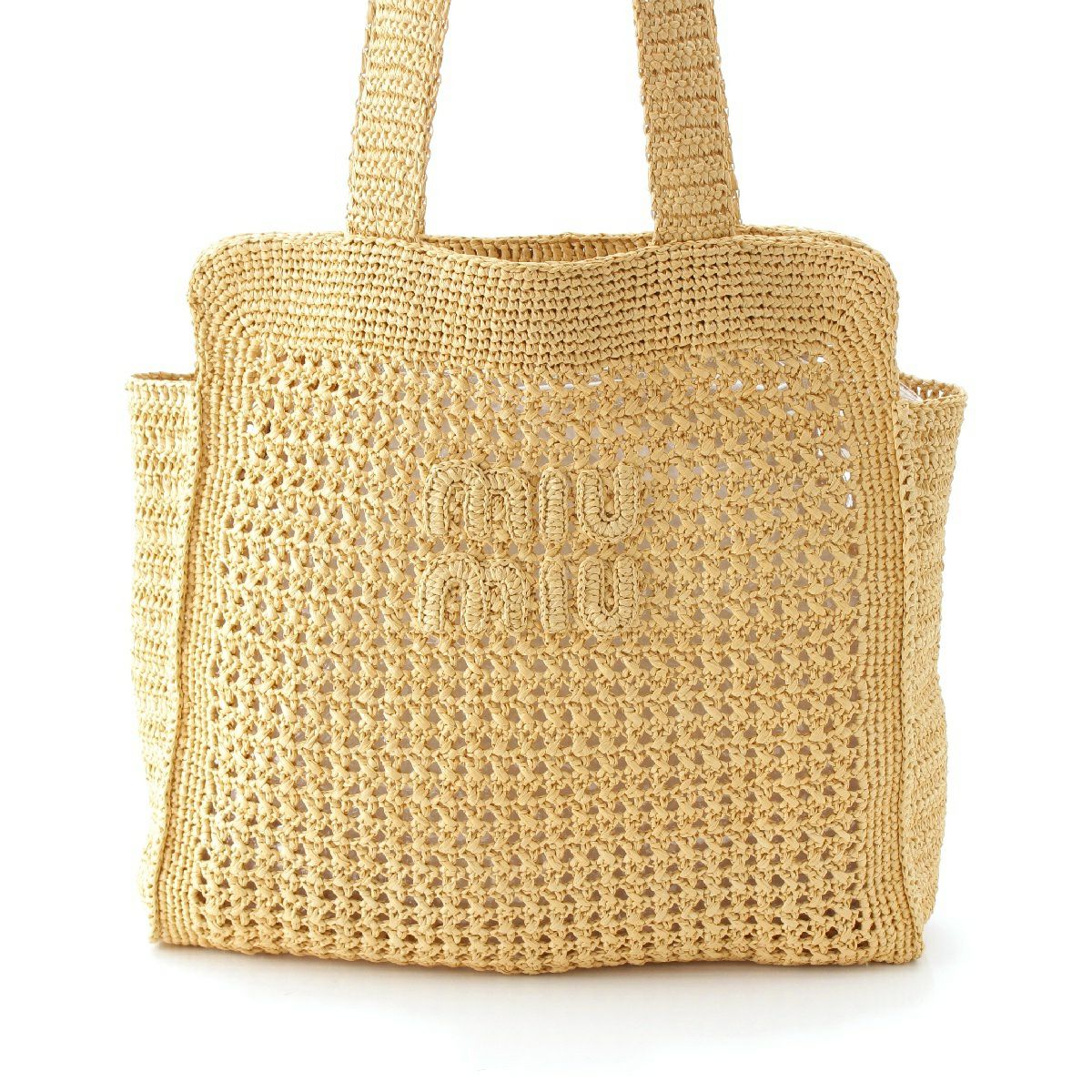ミュウミュウ ラフィアヤーン ルレックス ウーブン フロントロゴ刺繍 トートバッグ ベージュ