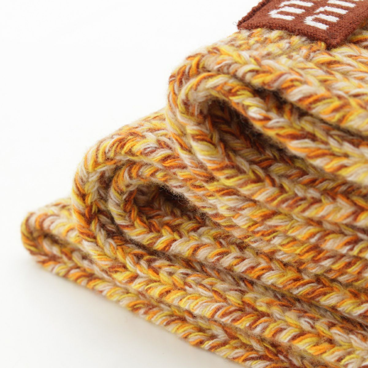 ミュウミュウ 23AW カシミヤ ウール ロゴパッチ メランジニット マフラー ストール 5FS048 イエロー ブラウン