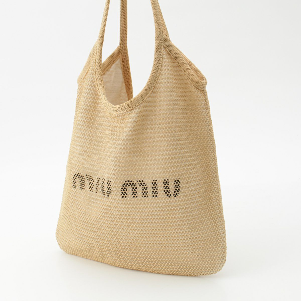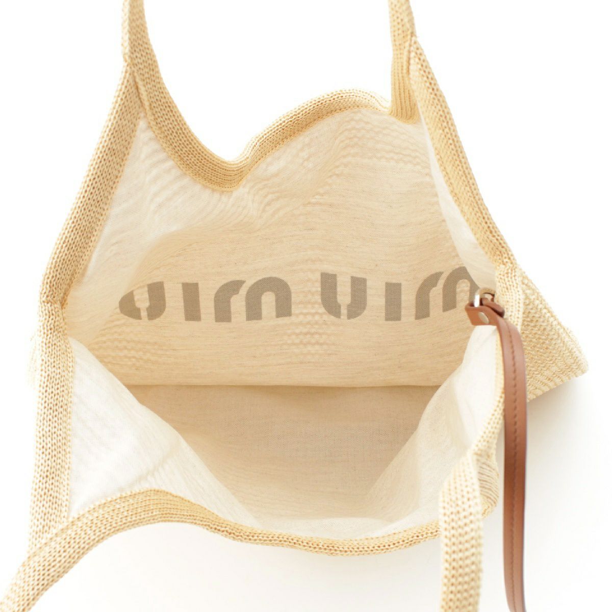 ミュウミュウ ラフィア リネン ロゴ レザーストラップ ポーチ付き トートバッグ ハンドバッグ 5BG231 ベージュ