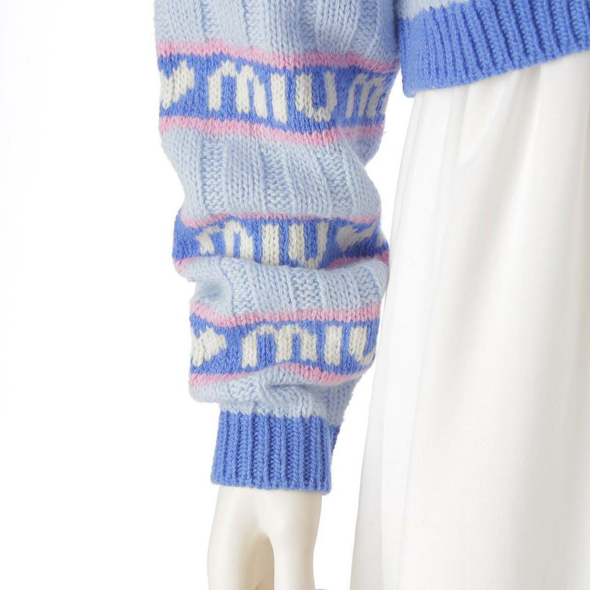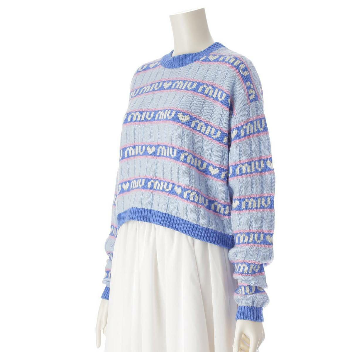 ミュウミュウ Miu Miu 21年 ロゴ ジャガード ボーダー 長袖 ニット セーター MML427 ブルー 38