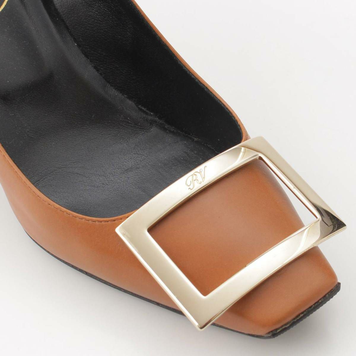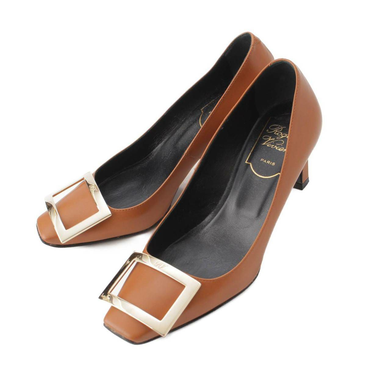 ロジェヴィヴィエ Roger Vivier スクエアトゥ スクエアバックル ヒール レザー パンプス ブラウン 34