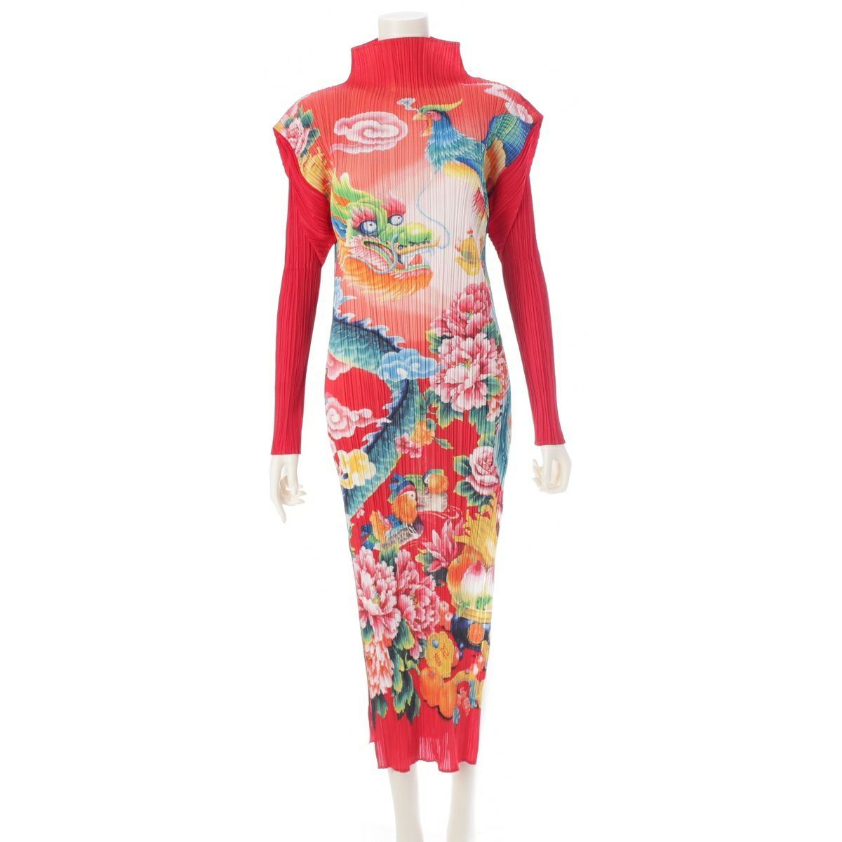 プリーツプリーズ イッセイミヤケ 1998 ドラゴン 龍 鳳凰 柄 ボトルネック ワンピース PP81-JH788 レッド マルチカラー 3
