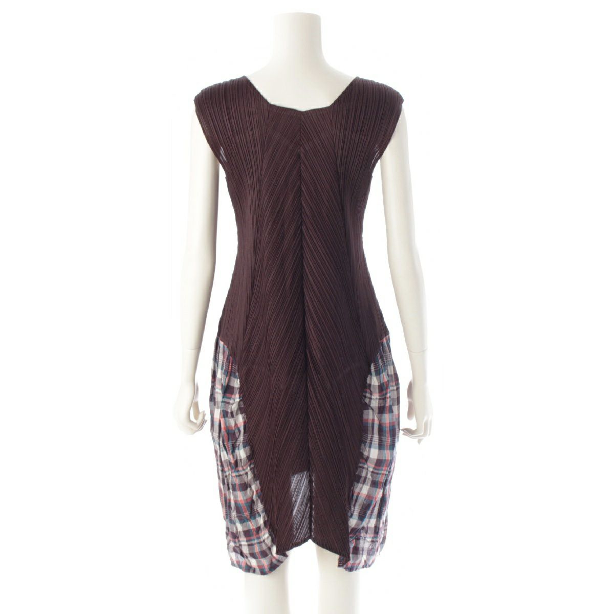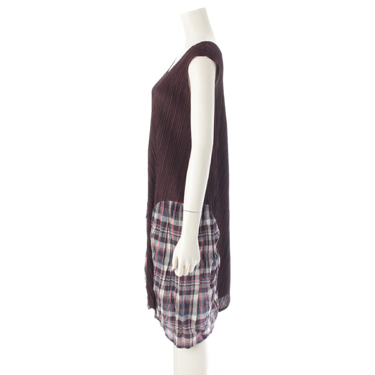 プリーツプリーズ イッセイミヤケ 異素材切替 チェック柄 ノースリーブ ワンピース ドレス PP03-JT565 ブラウン 3