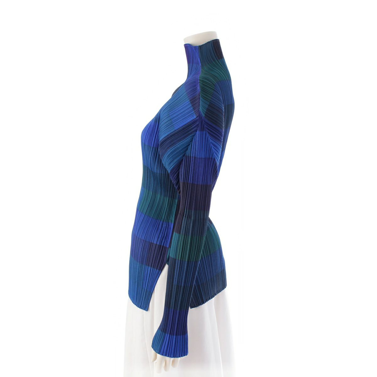 プリーツプリーズ イッセイミヤケ ボトルネック チェック柄 スリット 長袖 トップス カットソー PP83-JK804 ブルー 3