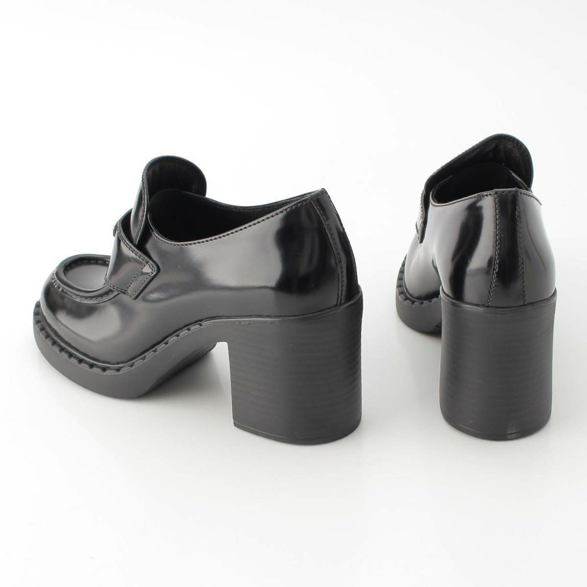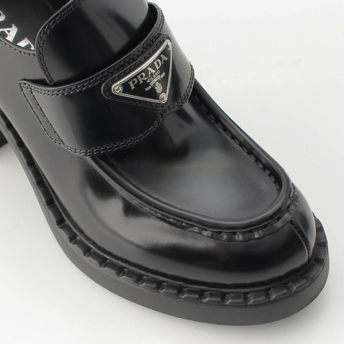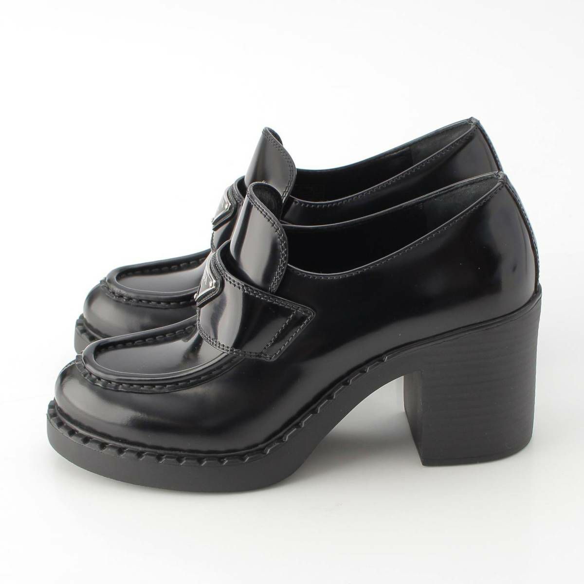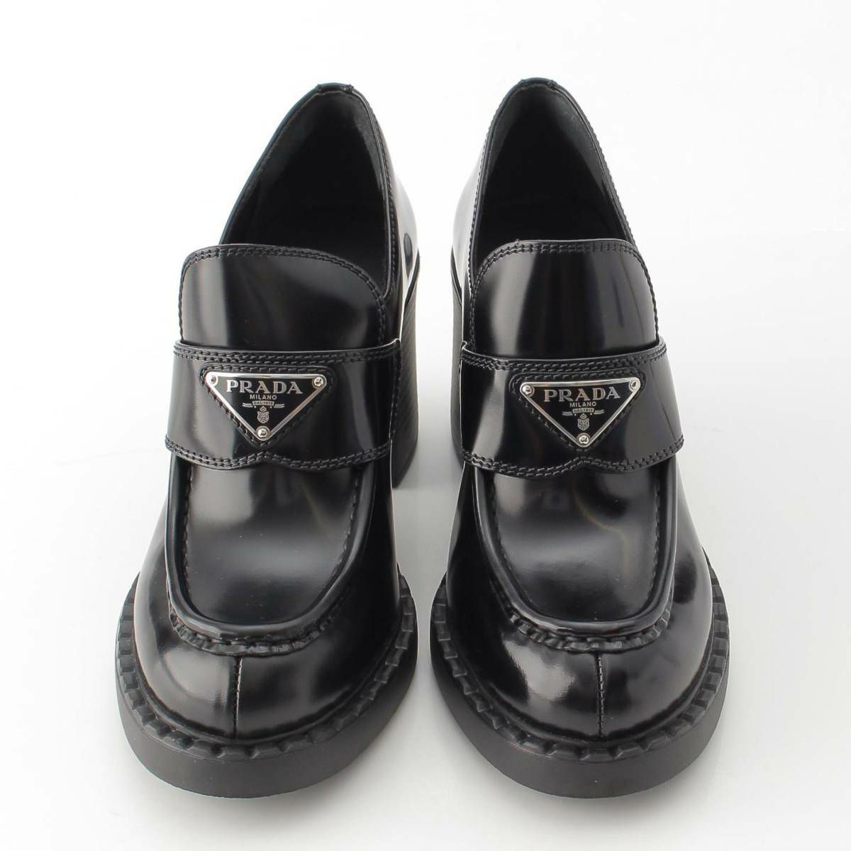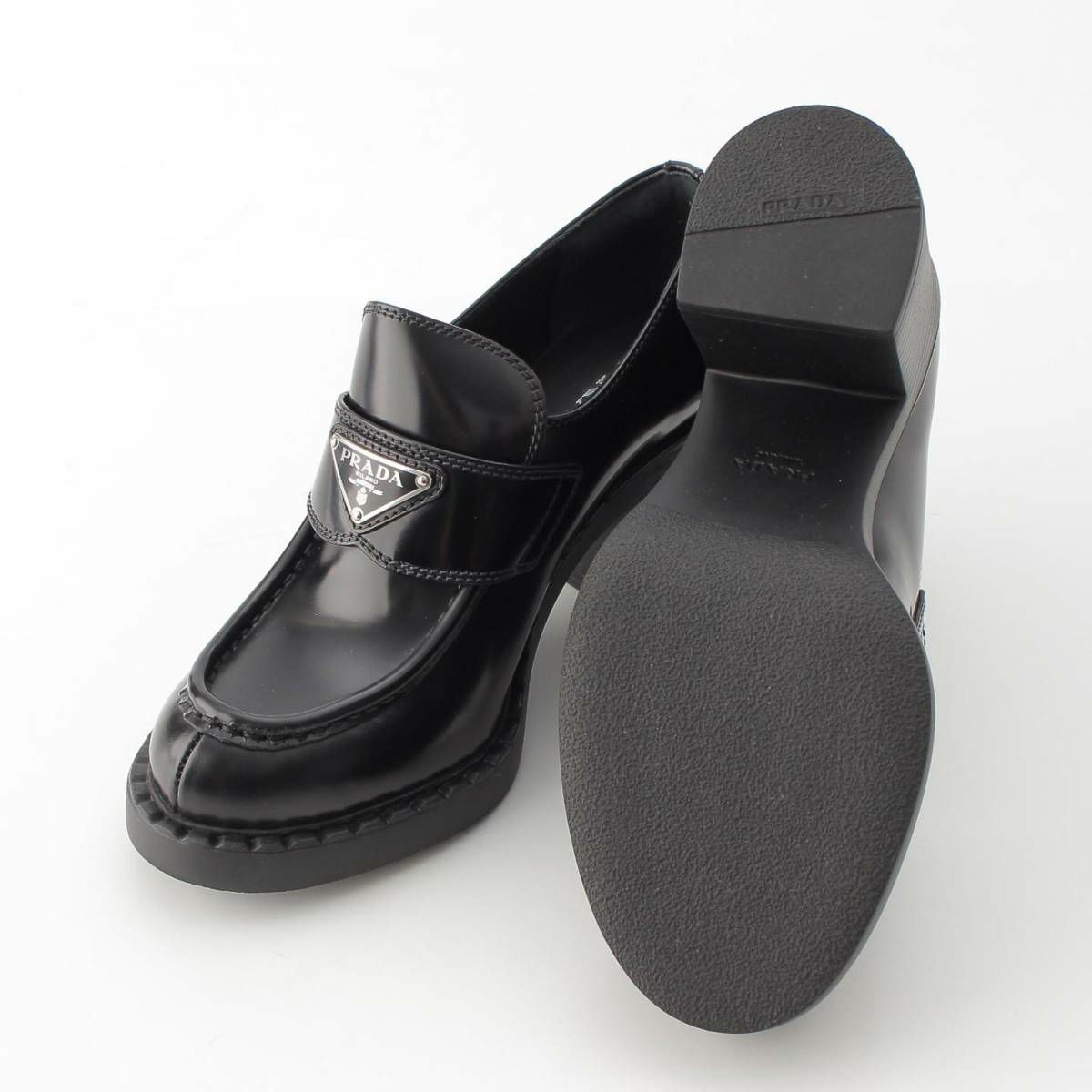 プラダ 三角ロゴ チョコレート ブラッシュドレザー ハイヒール ローファー ブラック 38