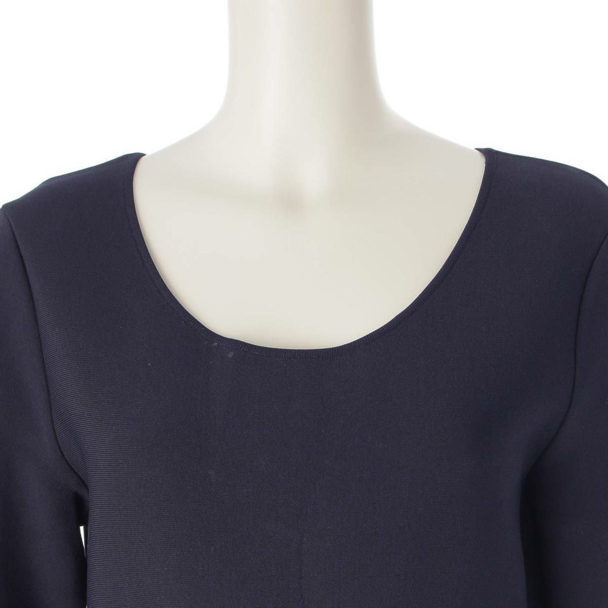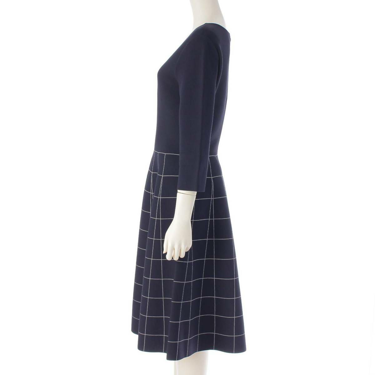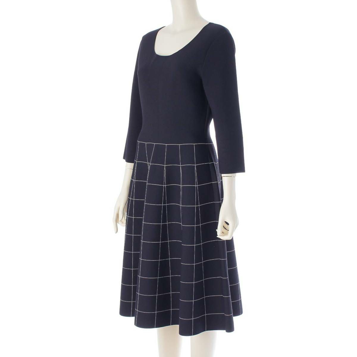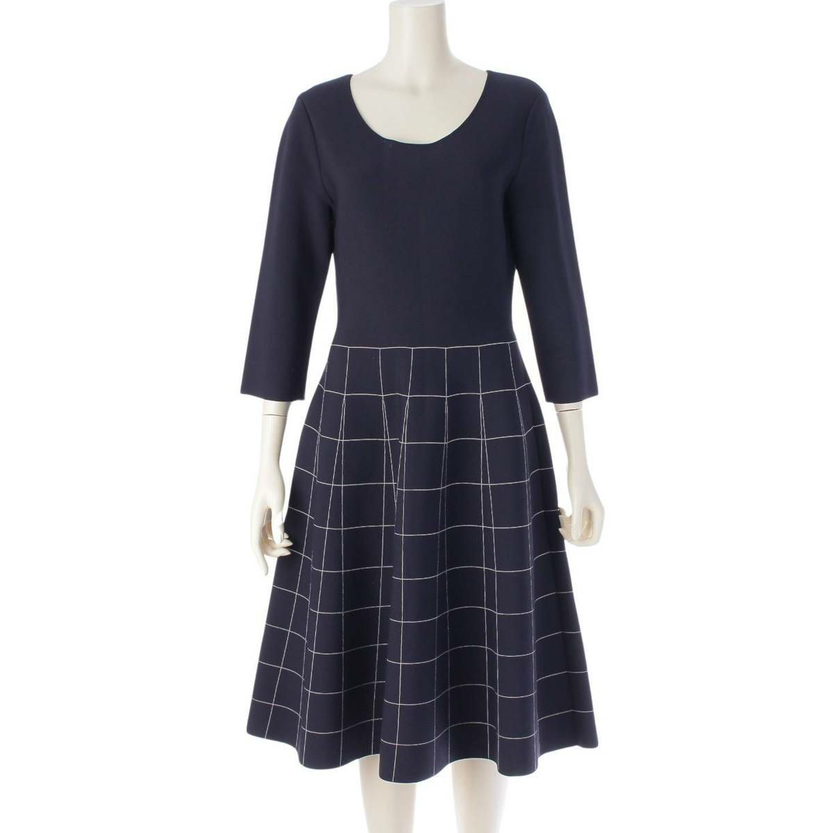 サルバトーレフェラガモ Salvatore Ferragamo ガンチーニ 格子柄 7分袖 グリッド クルーネック ワンピース ドレス ネイビー L