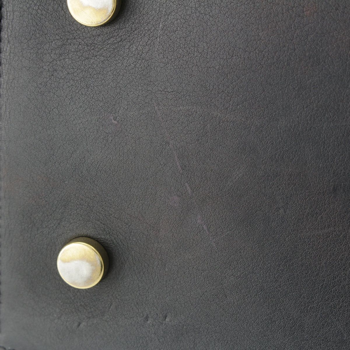 ダメージ箇所: 裏面、内部ポケット、底に変色、内側スエード部分にシミ/汚れ/変色/劣化、内底に汚れ/変色、内側にラメっぽい汚れ、ファスナー金具、ロゴ金具、底鋲にメッキがれ、浅い傷、