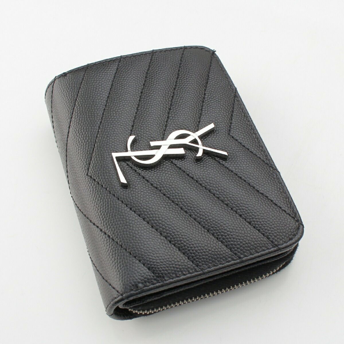 サンローラン レザー シルバー金具 Vステッチ YSLロゴ 小物 二つ折り財布 コンパクトウォレット GUE403723 ブラック
