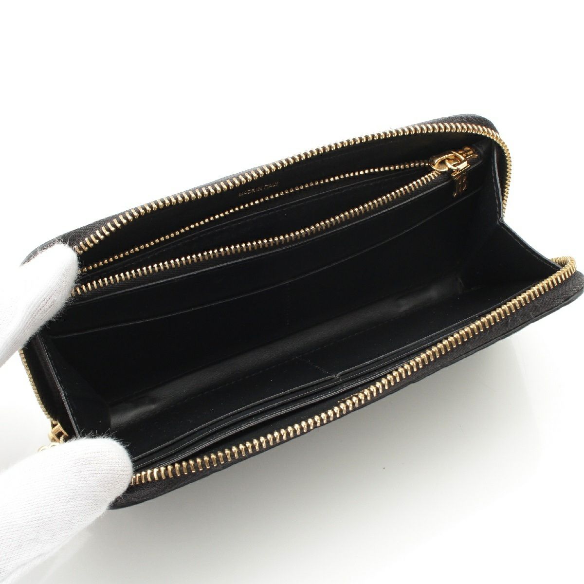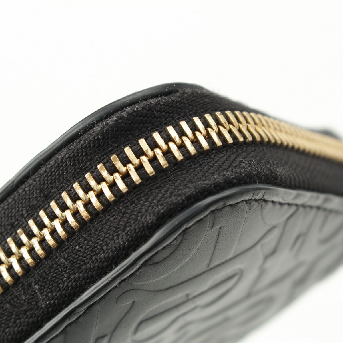 ダメージ箇所: 角、正面右端中央、背面上部中央、ファスナー金具等に擦れ/傷、ファスナーテープに毛羽立ち、小銭入れ内側等に汚れ、