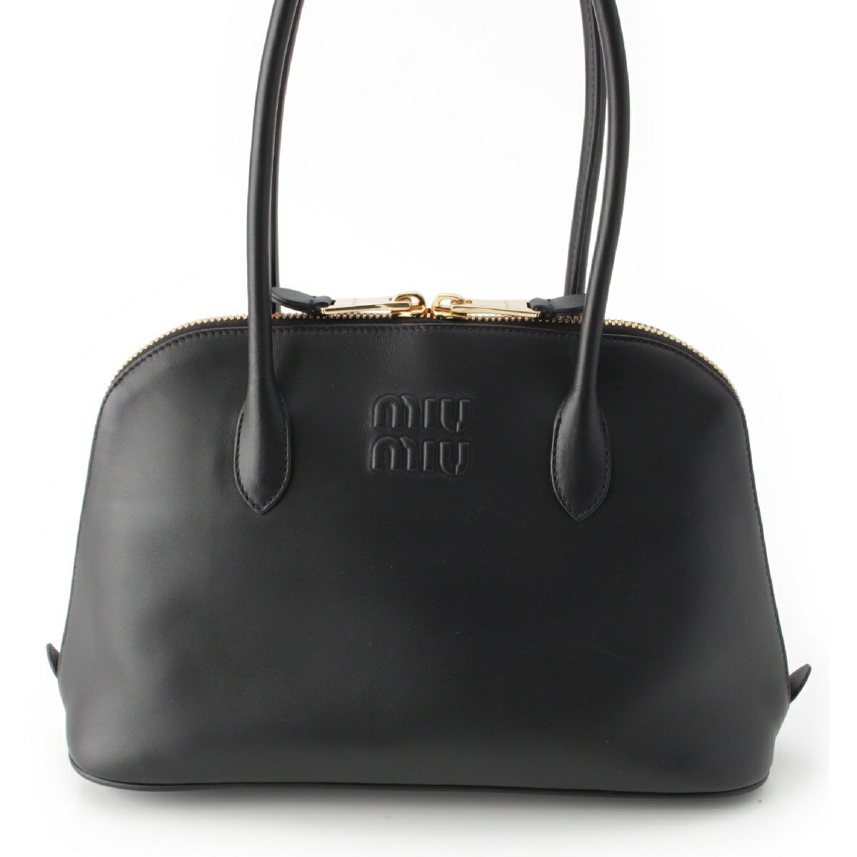 ミュウミュウ 24年 レザー ロゴ エンボス ハンドバッグ 5BA289 ブラック