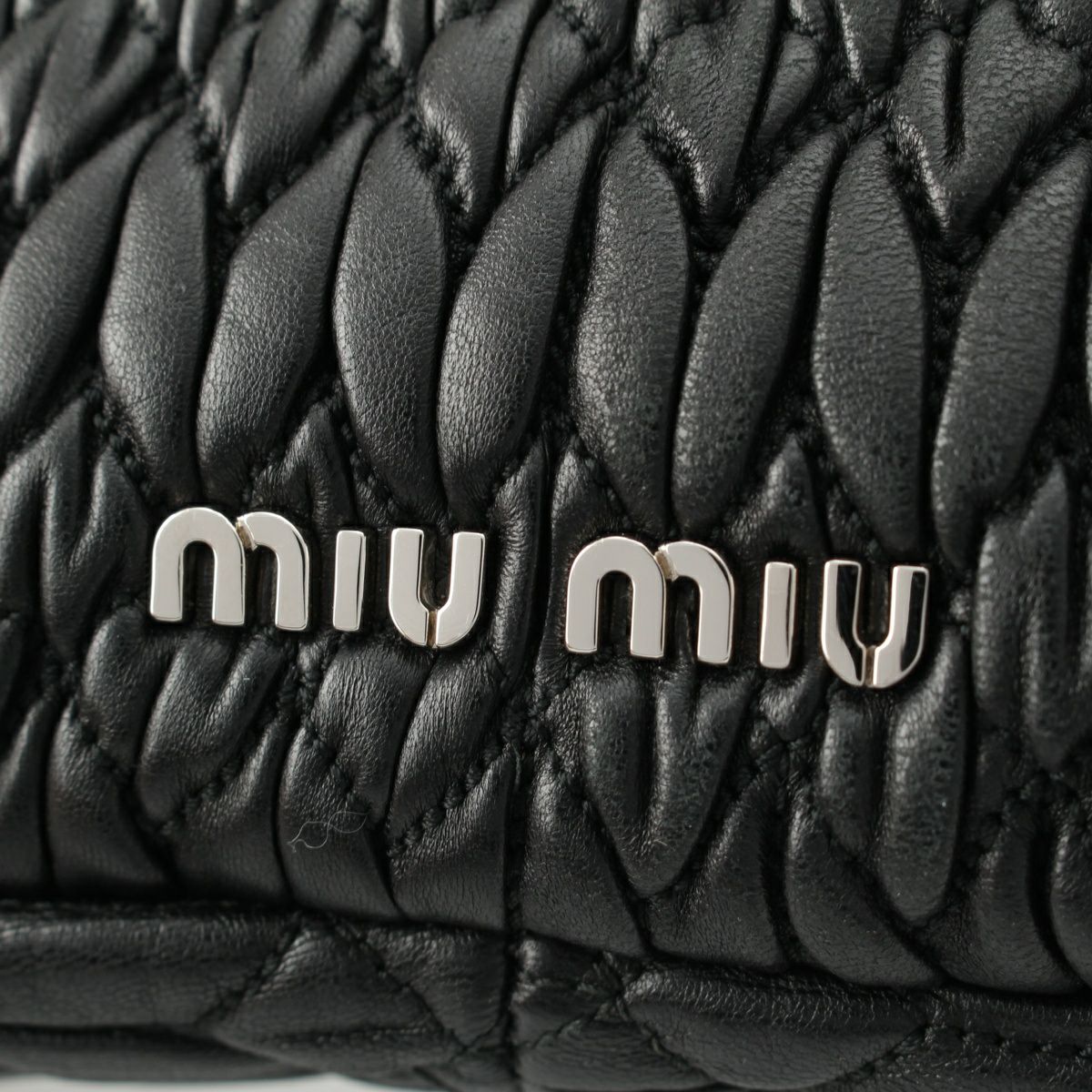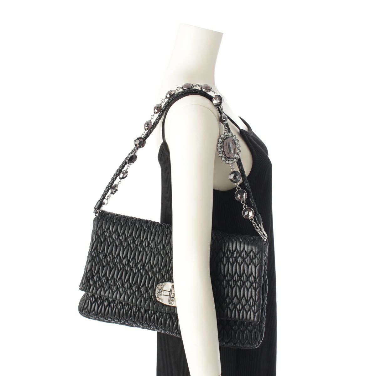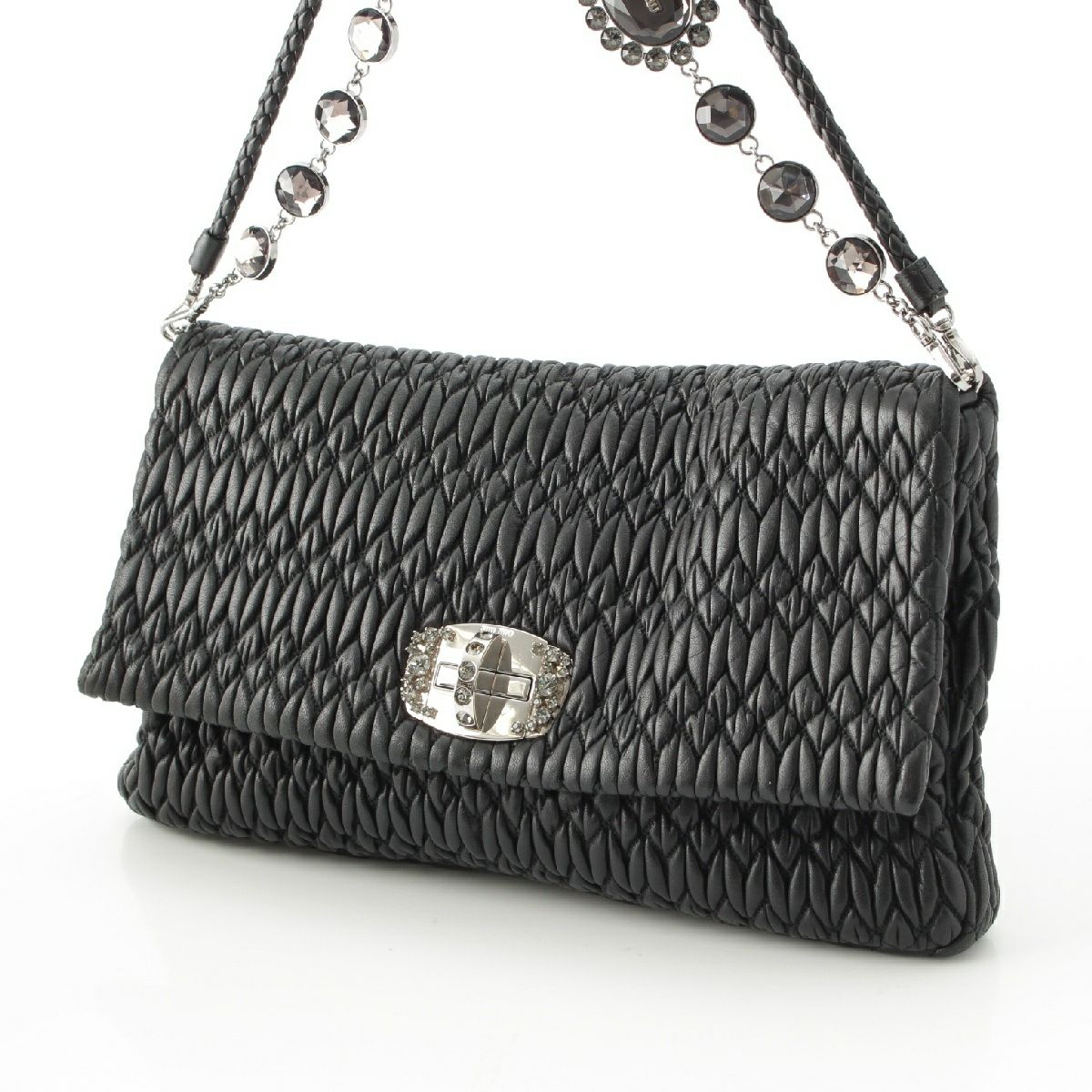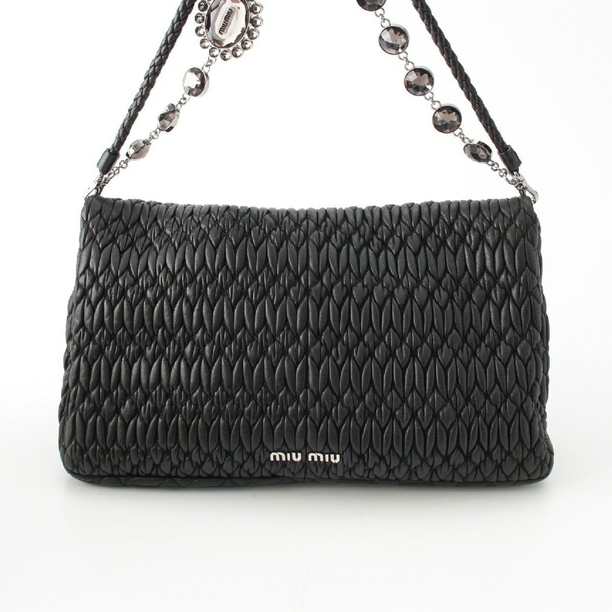 ミュウミュウ マテラッセ レザー クリスタルチェーン ハンドバッグ ダブルストラップ ロゴ ブラック