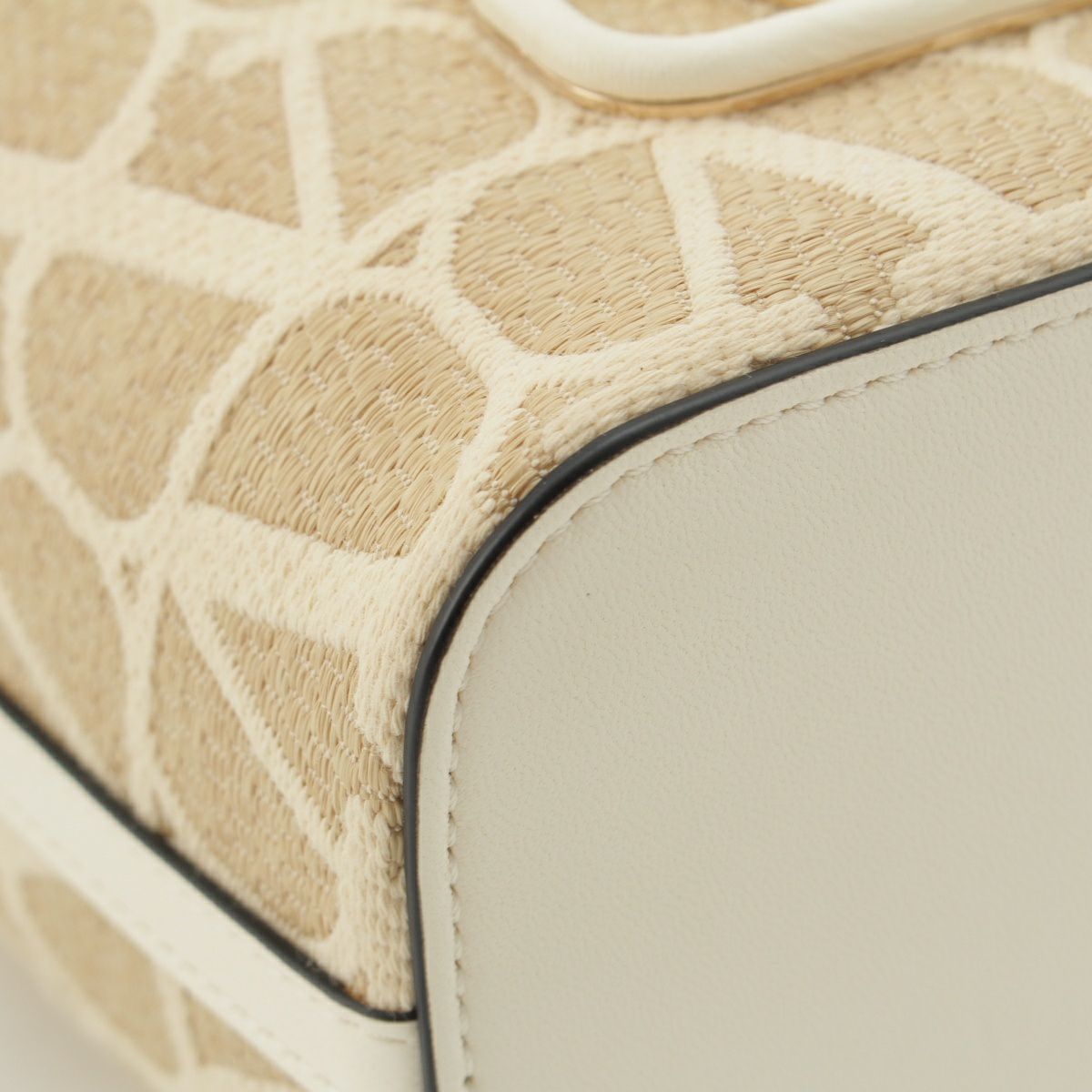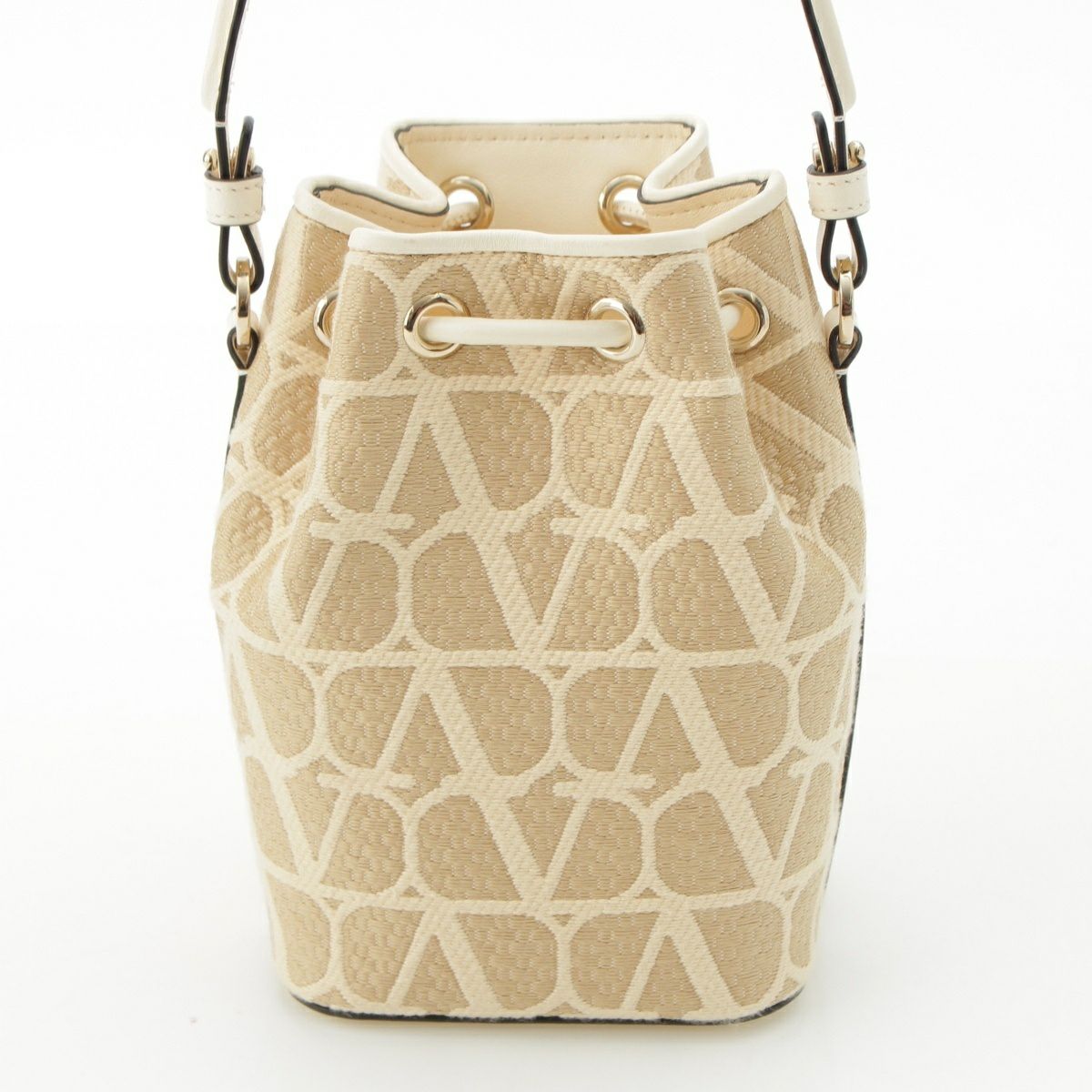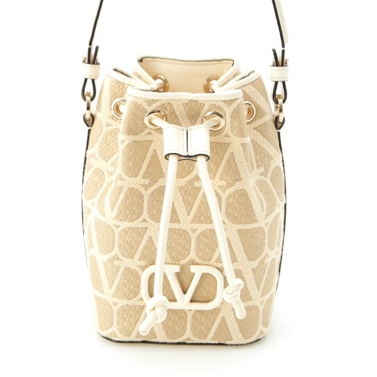 ヴァレンティノ キャンバス レザー Vロゴ シグネチャー トワル イコノグラフ ミニ ドローストリング ハンドバッグ バケット ベージュ ホワイト