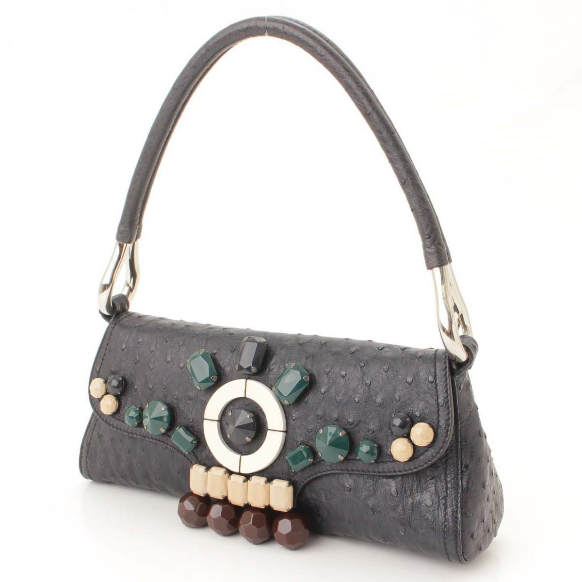 プラダ バック ロゴ ビジュー付き オーストリッチ ワンショルダー バッグ ネイビー