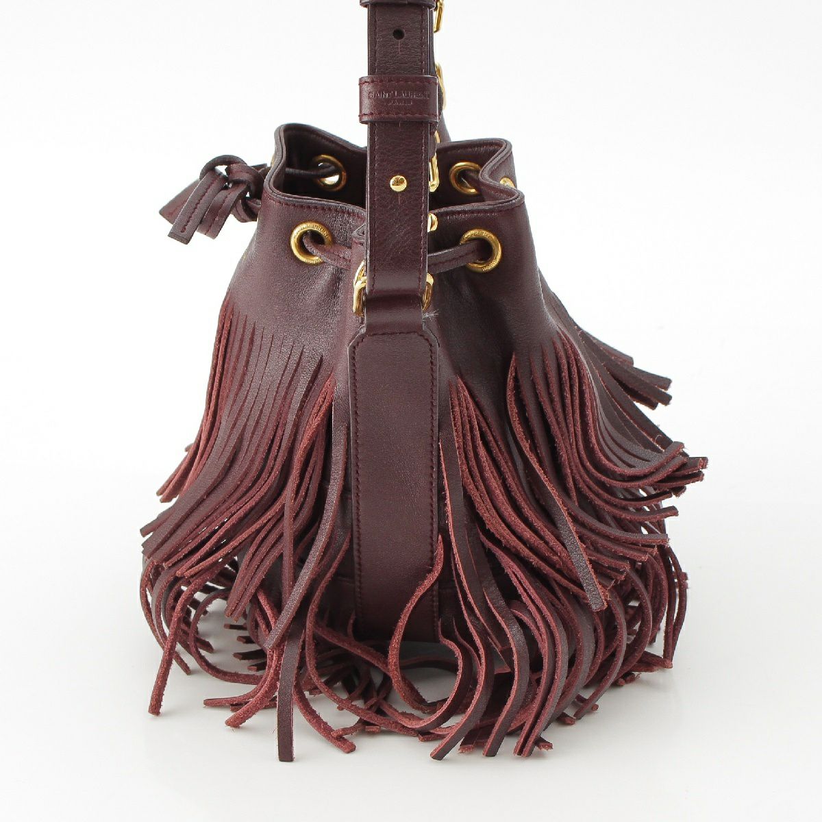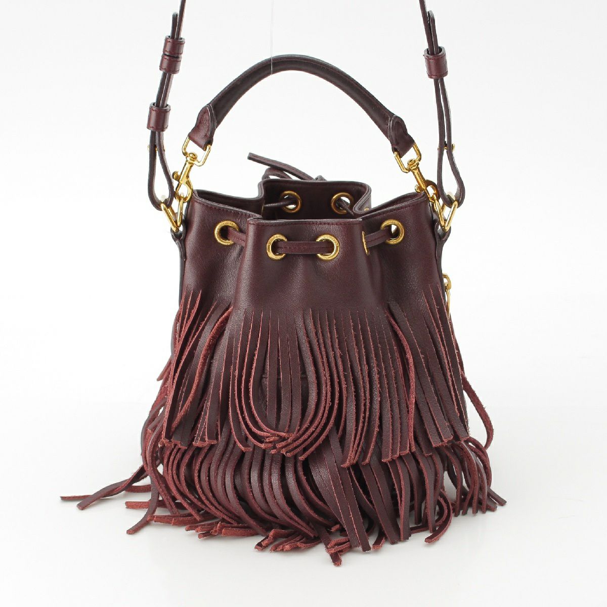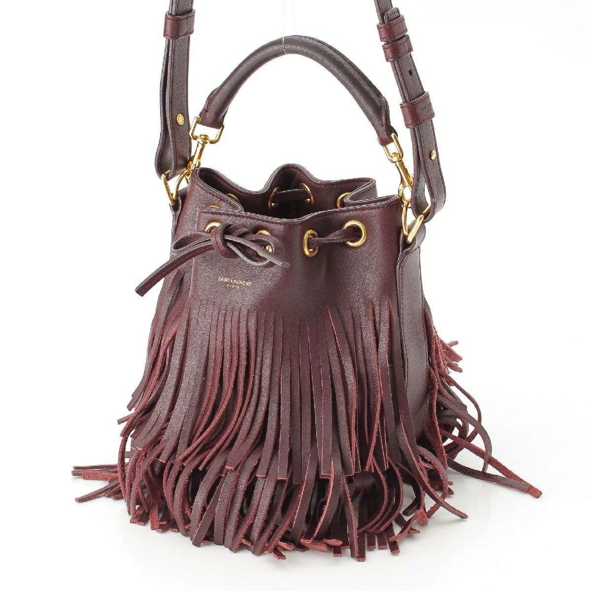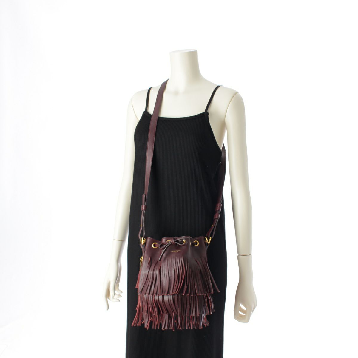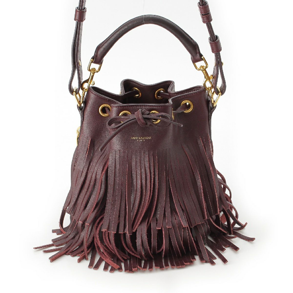 サンローラン エマニュエル レザー フリンジ ドローストリング トップハンドル 2WAY ショルダーバッグ バケット 357603 バーガンディ