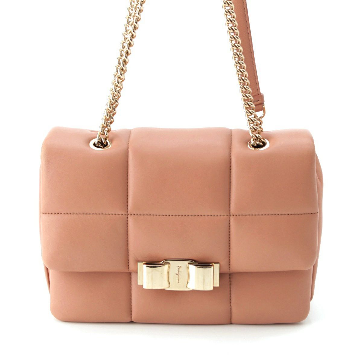 サルヴァトーレフェラガモ ラムスキン ヴァラリボン キルティング チェーン ショルダーバッグ ピンクベージュ