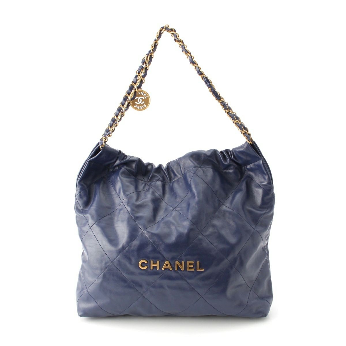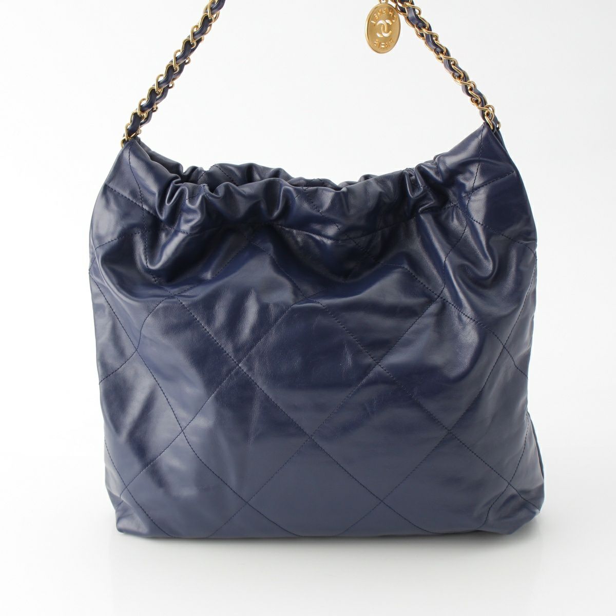 シャネル 22 シャイニーカーフスキン ラージ ロゴ チェーン ショルダーバッグ ネイビー