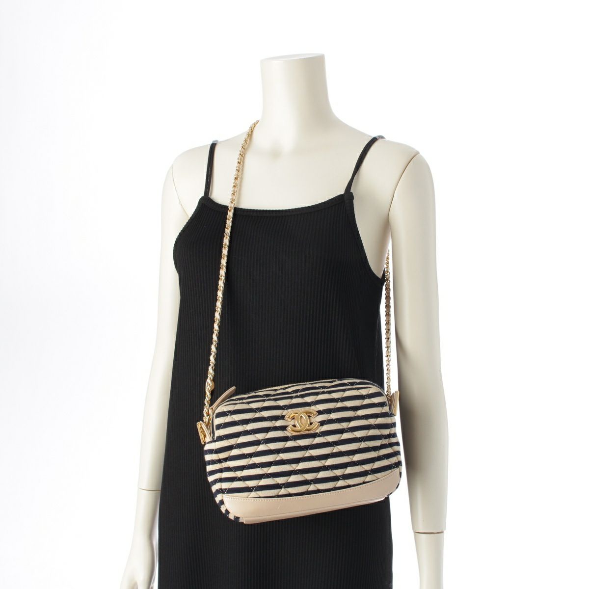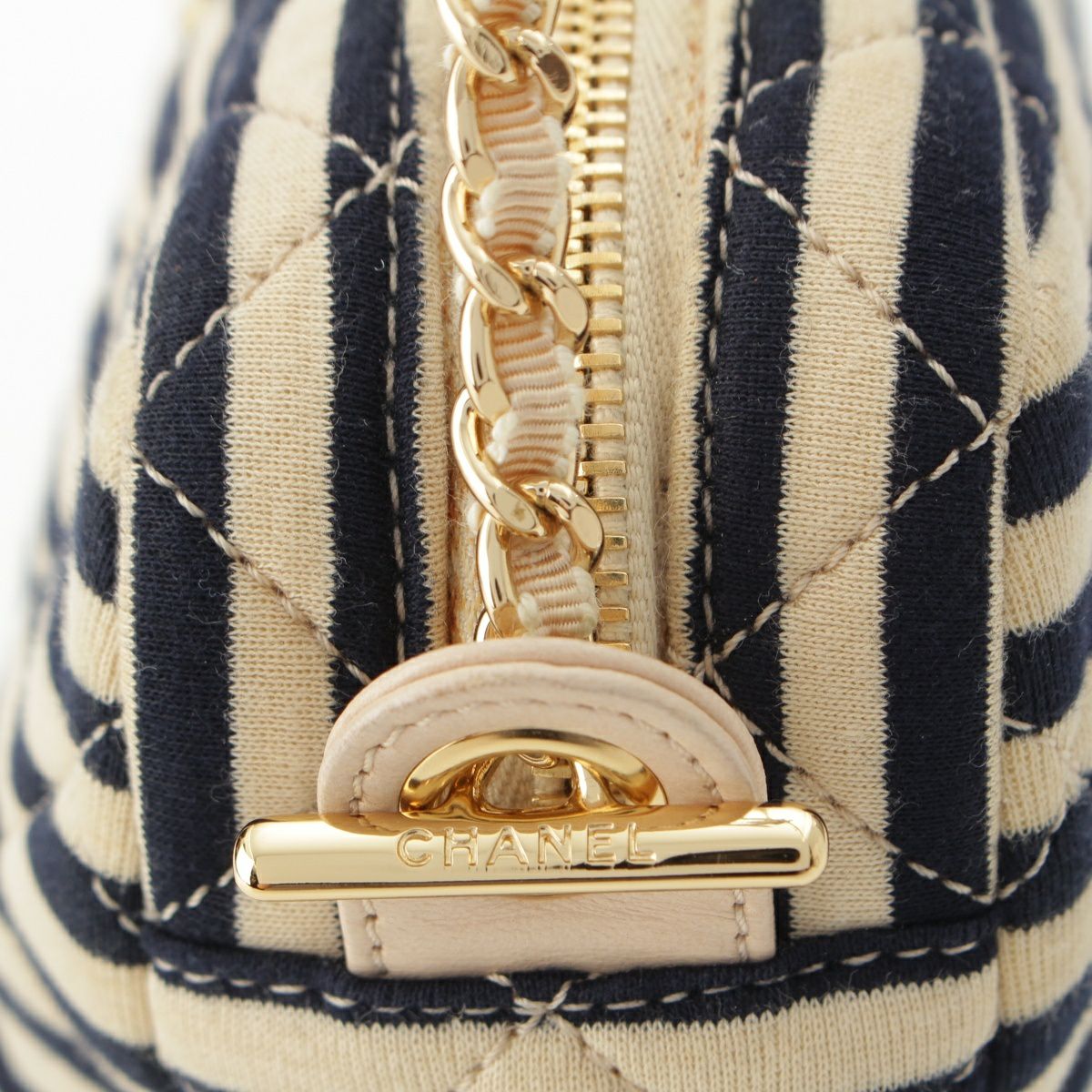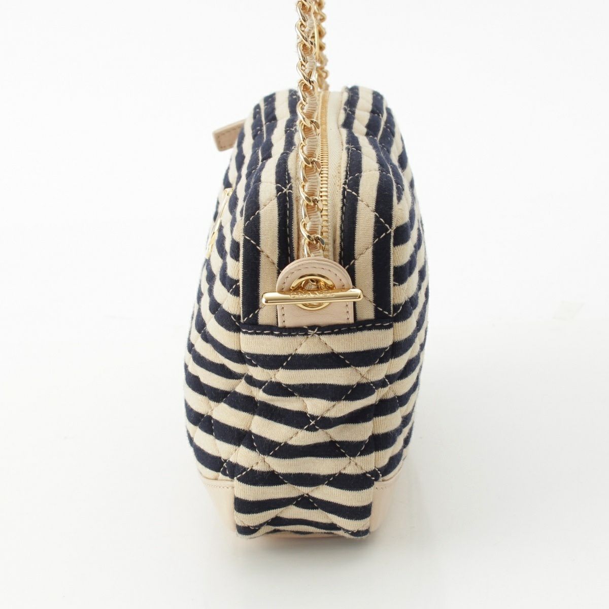 シャネル コットン 18番台 ココマーク ボーダー チェーン ショルダーバッグ ポーチ ネイビー×ベージュ