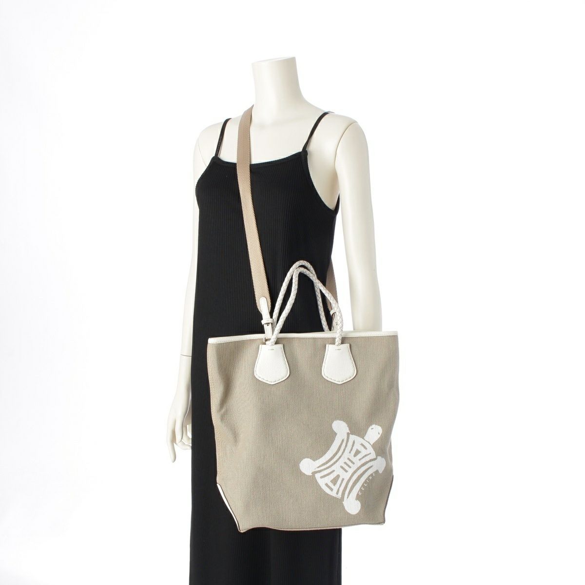 セリーヌ キャンバス×レザー マカダム タートル 2WAY ショルダー トートバッグ ホワイト×ベージュ